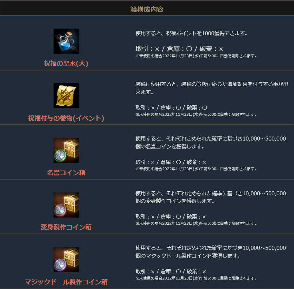 ※一部アイテムは未使用の場合、一定期間が経過すると自動で削除されます。詳しくは各アイテムの詳細をご確認ください。