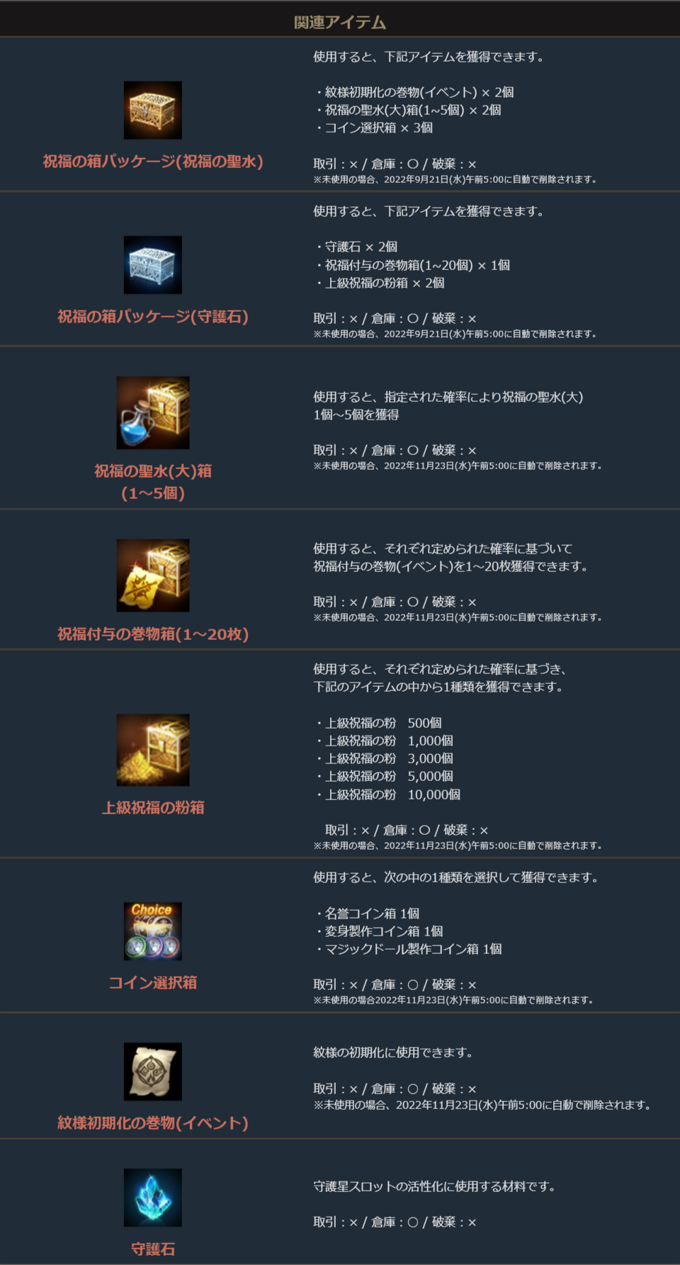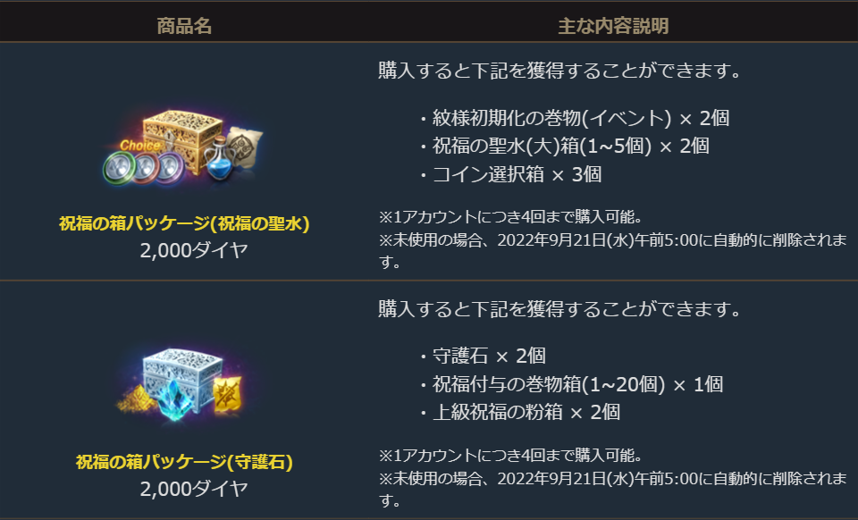 それぞれ「紋様初期化の巻物(イベント)」「祝福の聖水(大)」か「守護石」「祝福付与の巻物(イベント)」等キャラクターの強化に必要なアイテムが獲得できるパッケージです。
