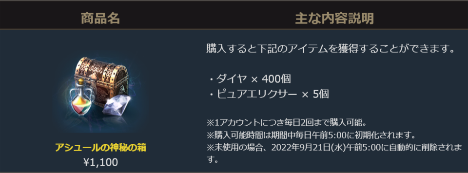 ダイヤとピュアエリクサー5個が毎日購入可能なお得なパッケージです。