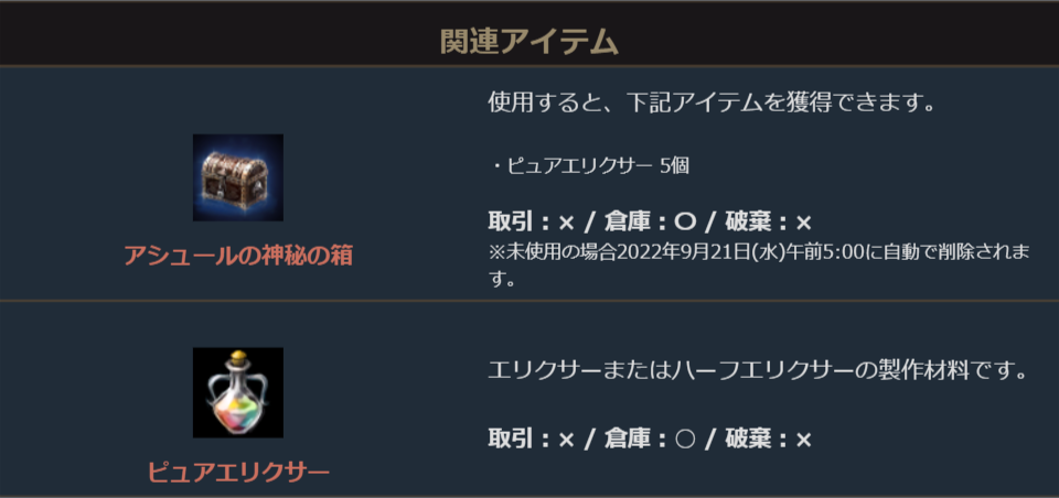 ※一部アイテムは未使用の場合、一定期間が経過すると自動で削除されます。詳しくは各アイテムの詳細をご確認ください。
