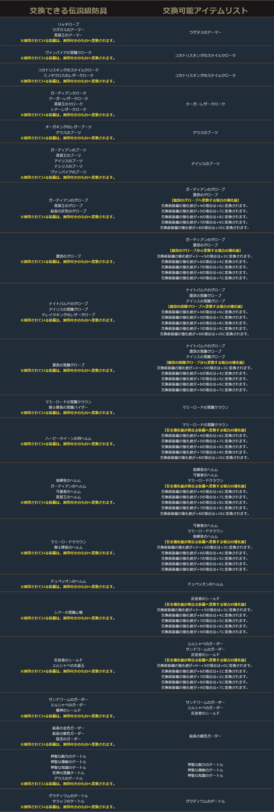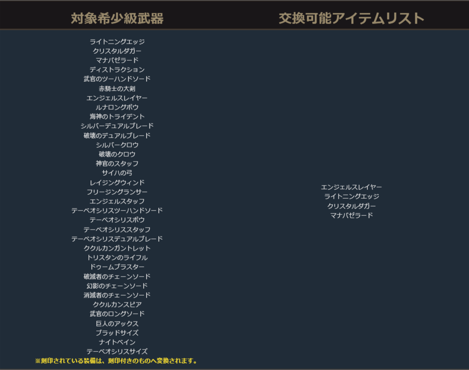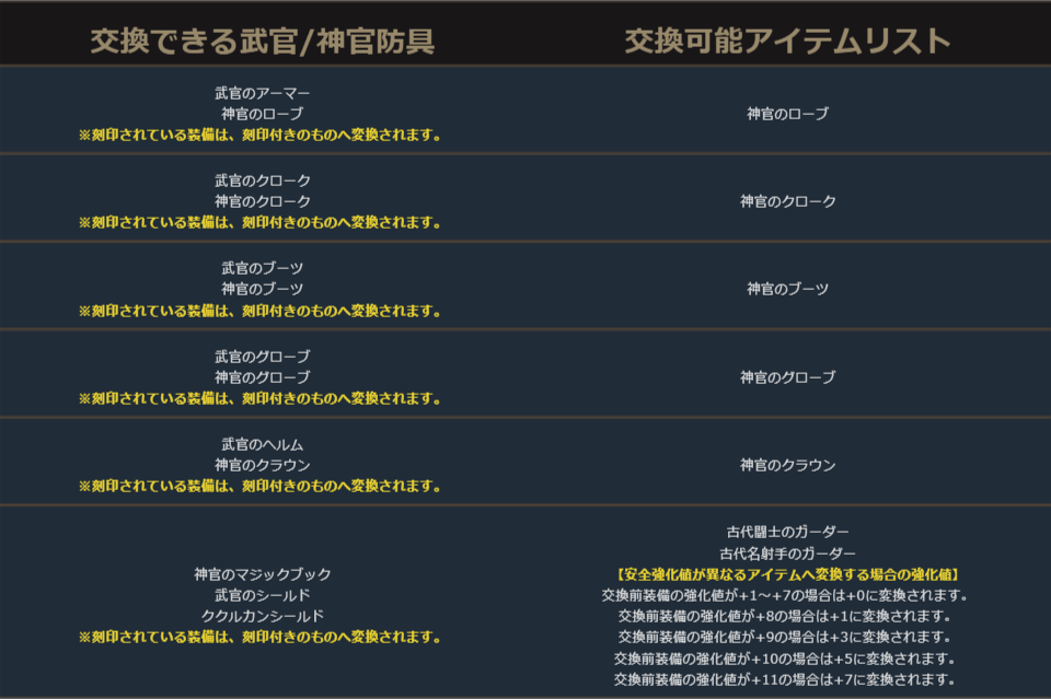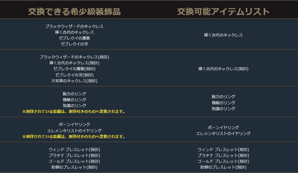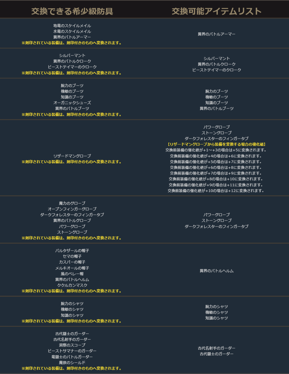 クラスチェンジを行う際に交換可能なアイテムは、下記の希少級以上のクラスチェンジ前のキャラクターが装備可能なアイテムが対象となります。
