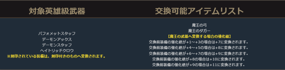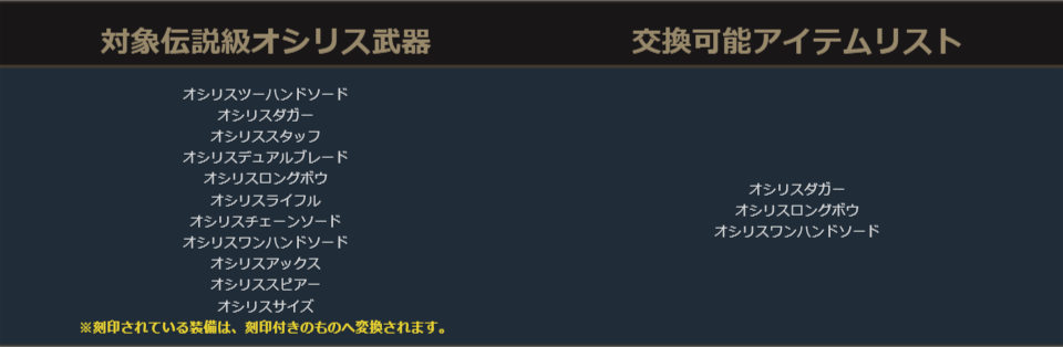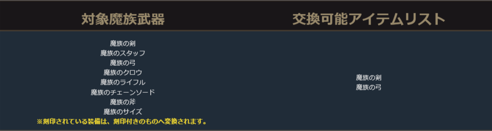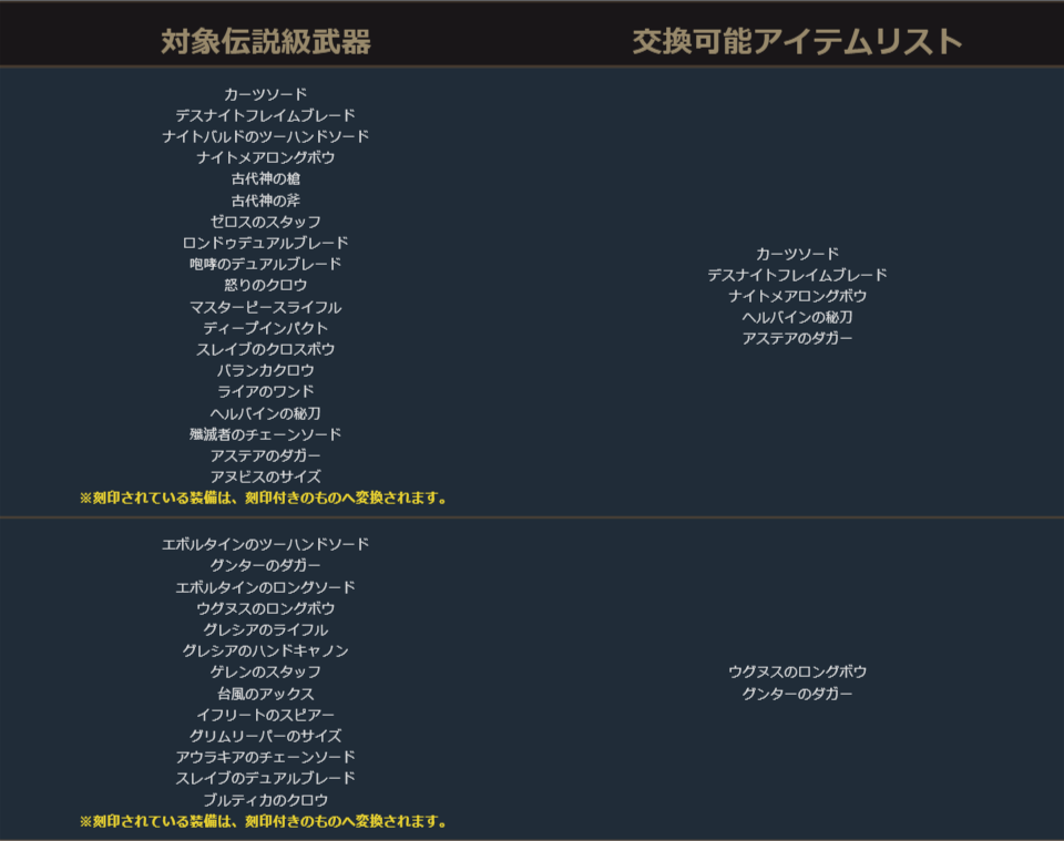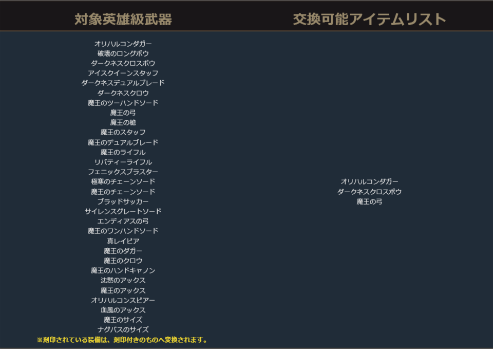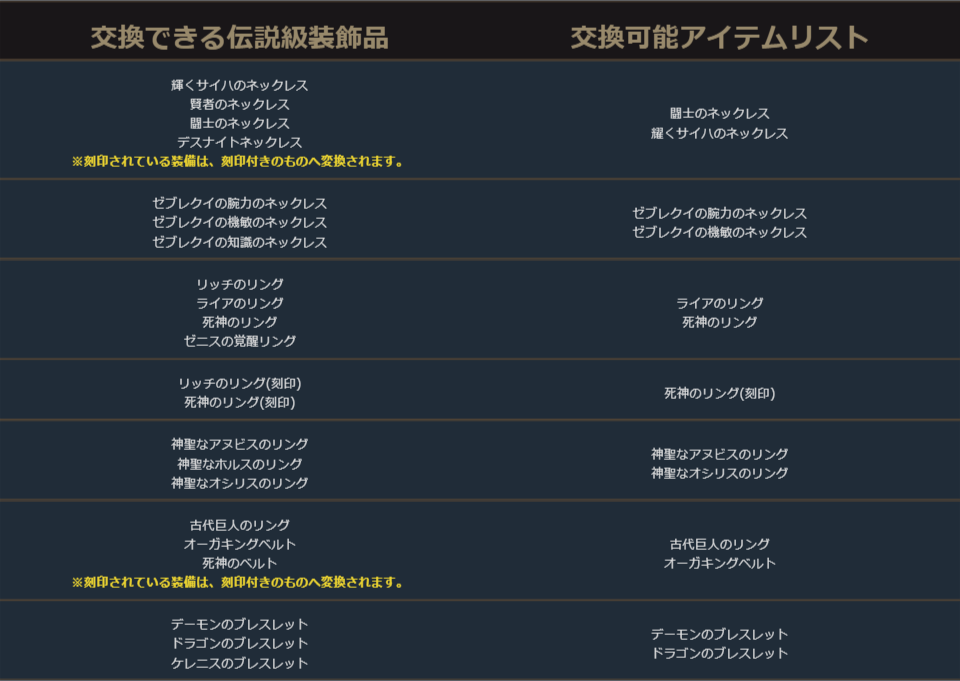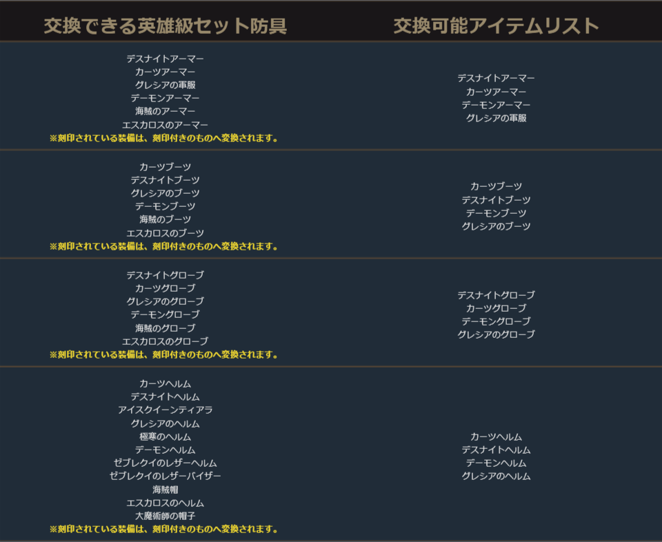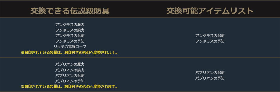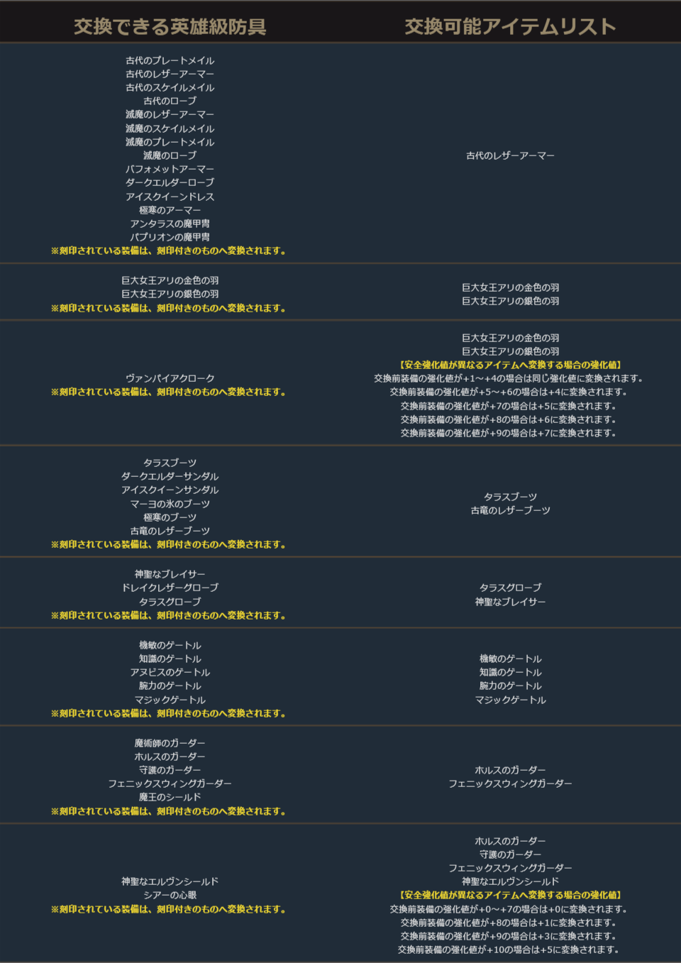 クラスチェンジを行う際に交換可能なアイテムは、下記の希少級以上のクラスチェンジ前のキャラクターが装備可能なアイテムが対象となります。