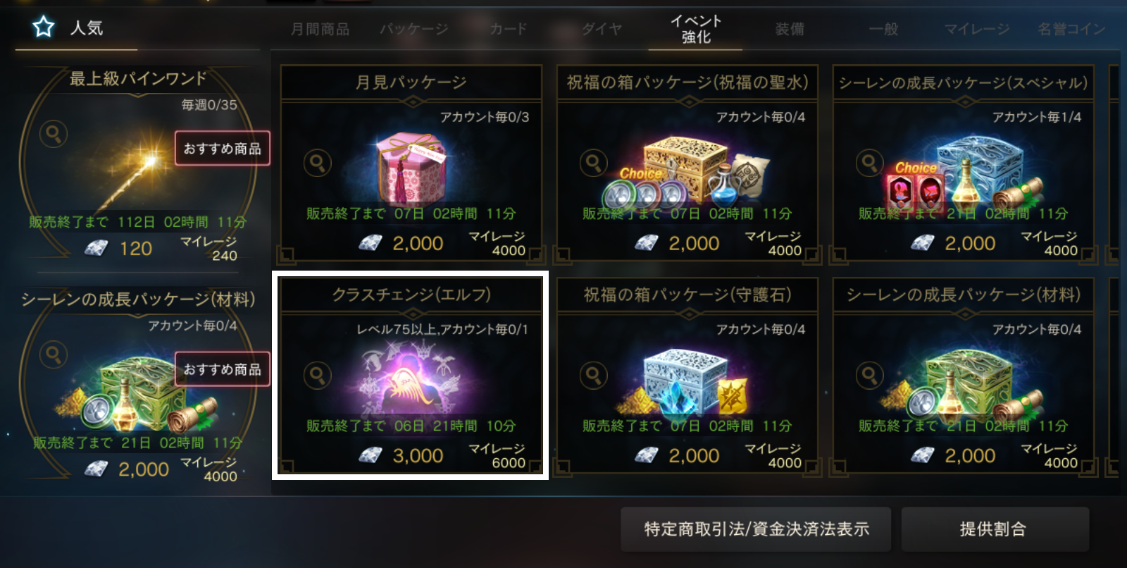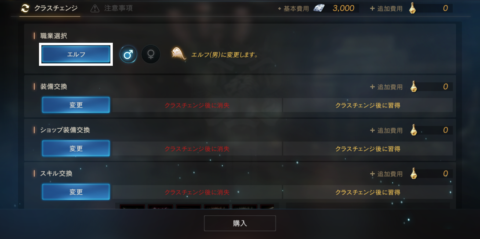 クラスチェンジとは、商品を購入したキャラクターの職業を、キャラクター名と経験値を維持したまま「エルフへ変更」するサービスです。