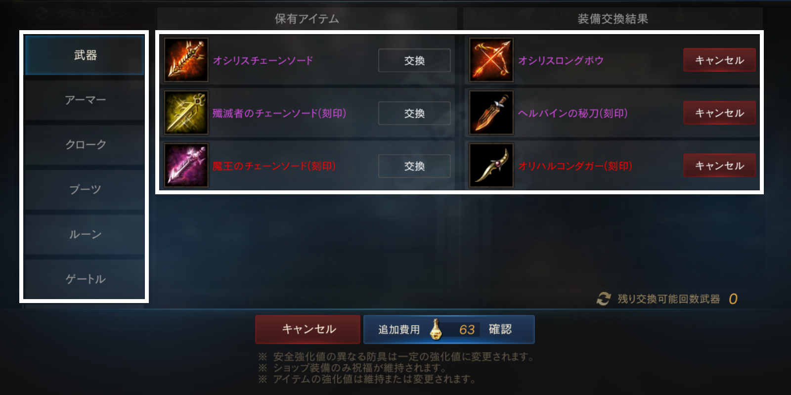※【ご注意】本項目で装備の交換を行わない場合、後から交換することは出来ませんので必ず忘れないようお願い致します。