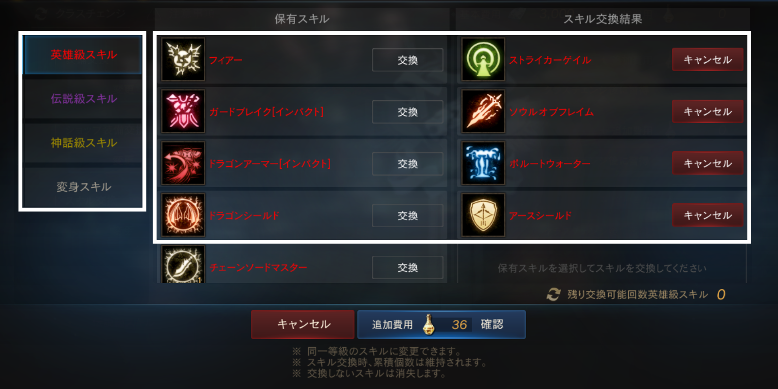 英雄級以上の習得済みスキルは、同一等級のスキルへ変換できます。