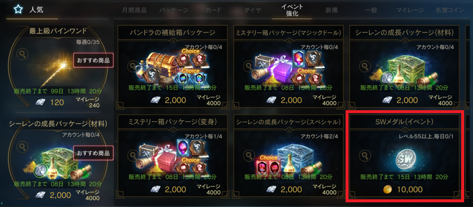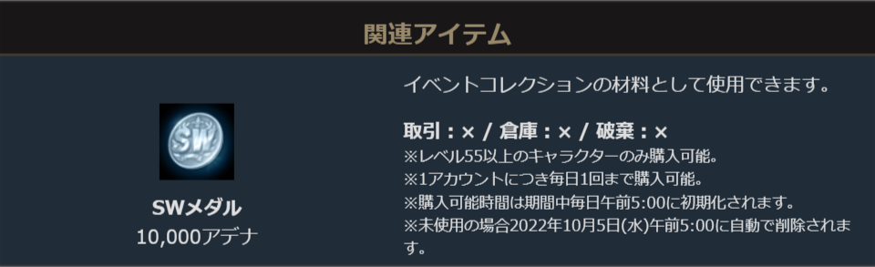 イベント期間中、ゲーム内ショップにてイベントアイテム「SWメダル」をアデナで交換可能です。