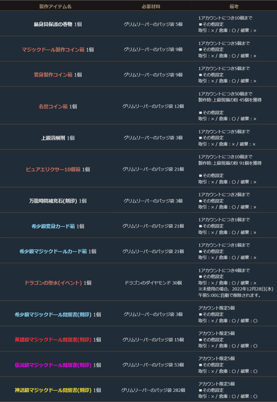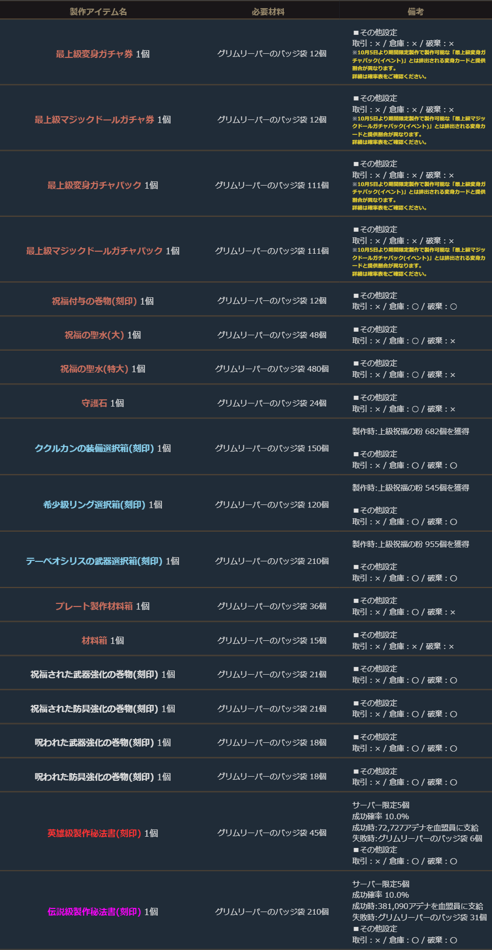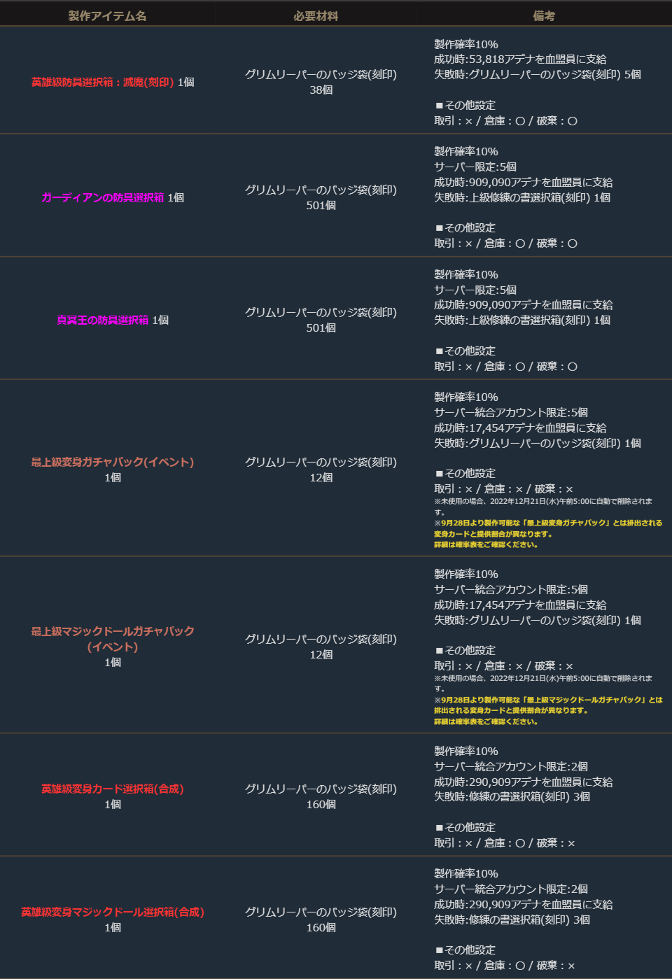 期間中、「グリムリーパーのバッジ袋(刻印)」を使用して、下記の製作を行うことができます。