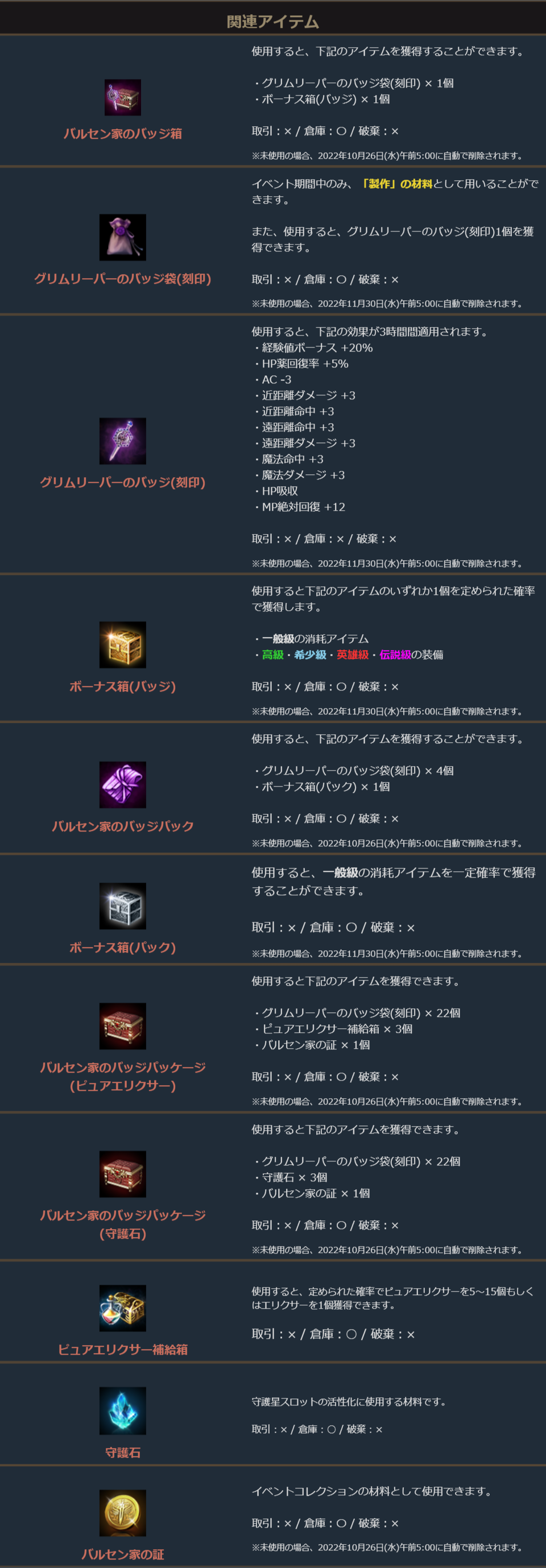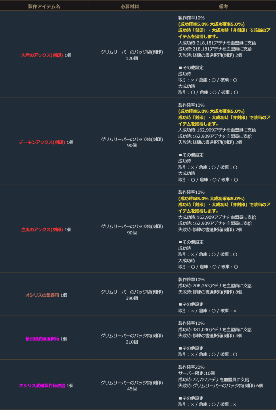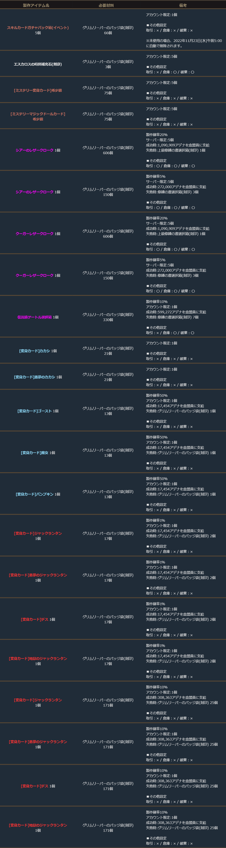 期間中、「グリムリーパーのバッジ袋(刻印)」を使用して、下記の製作を行うことができます。
