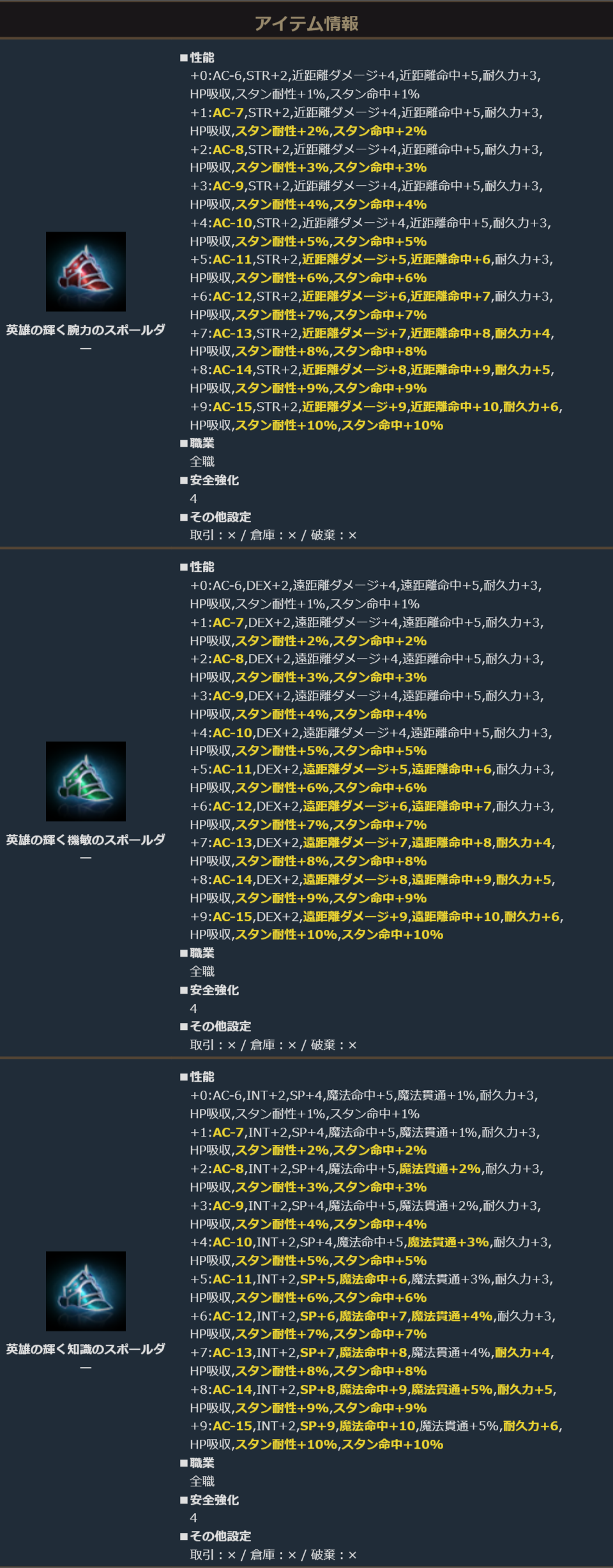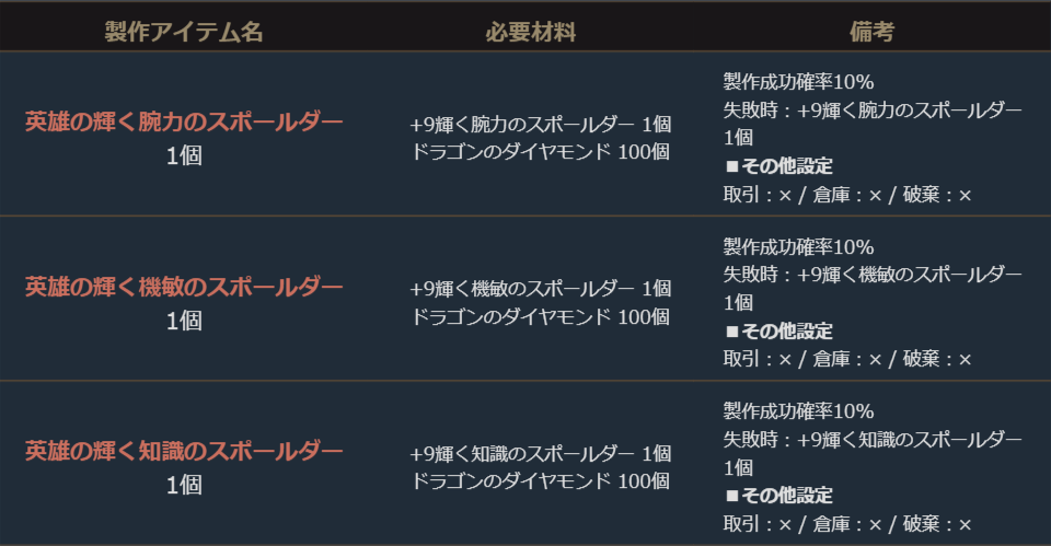 各種「+9 輝くスポールダー」を素材とすることで、対応する「英雄の輝くスポールダー」の製作に挑戦することができます。