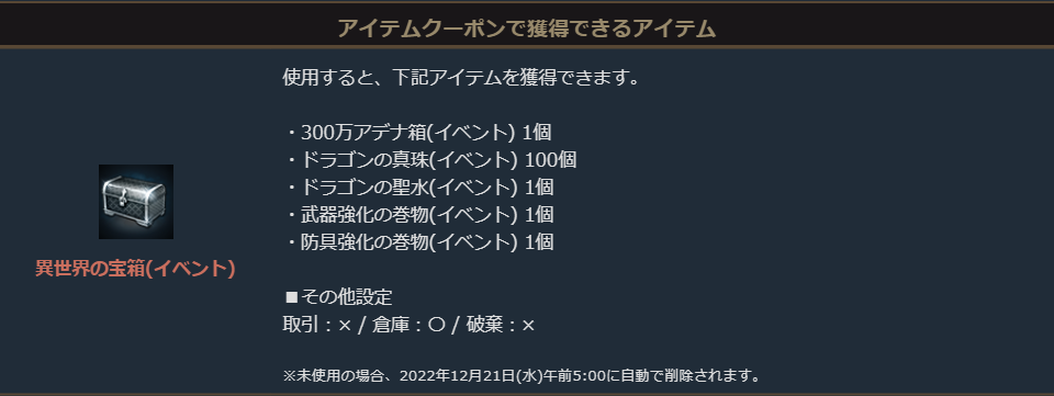 クーポン獲得後クーポンページにアイテムクーポンコードを入力することで下記のアイテムが利用できます。