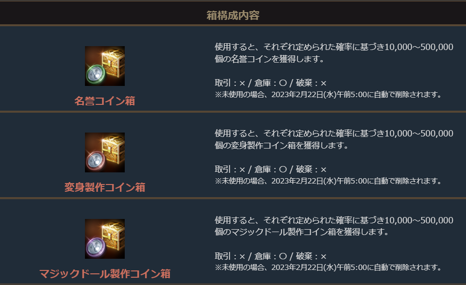 ※一部アイテムは未使用の場合、一定期間が経過すると自動で削除されます。詳しくは各アイテムの詳細をご確認ください。