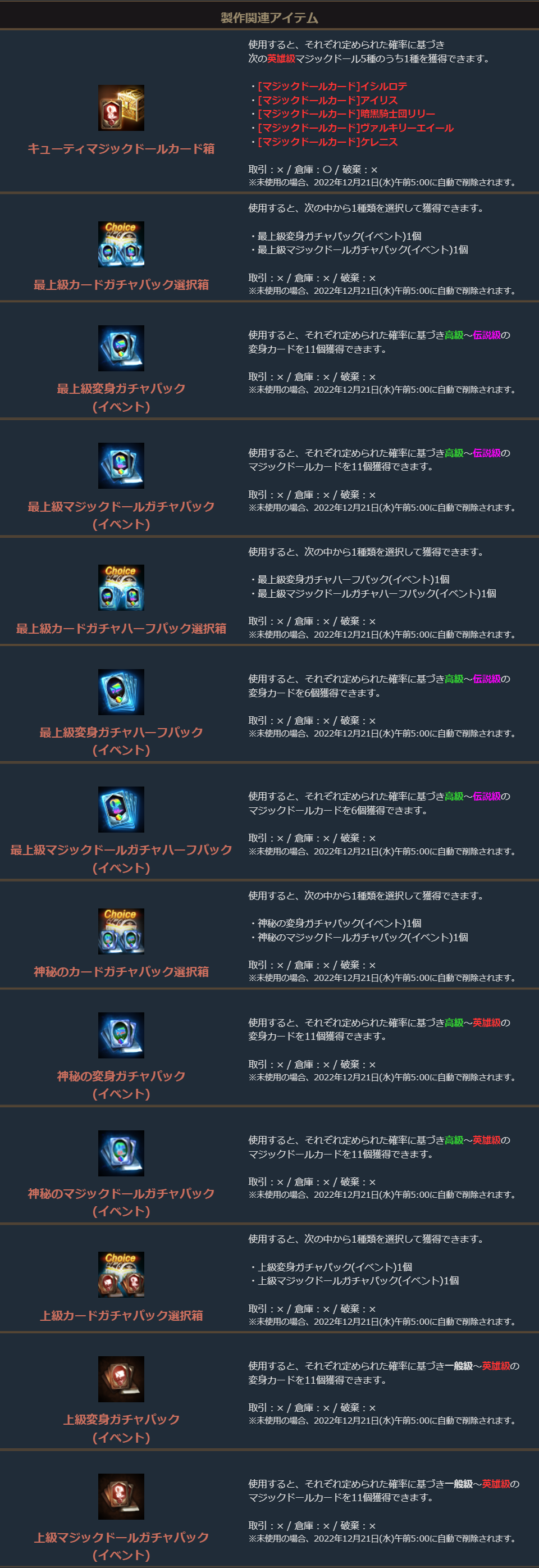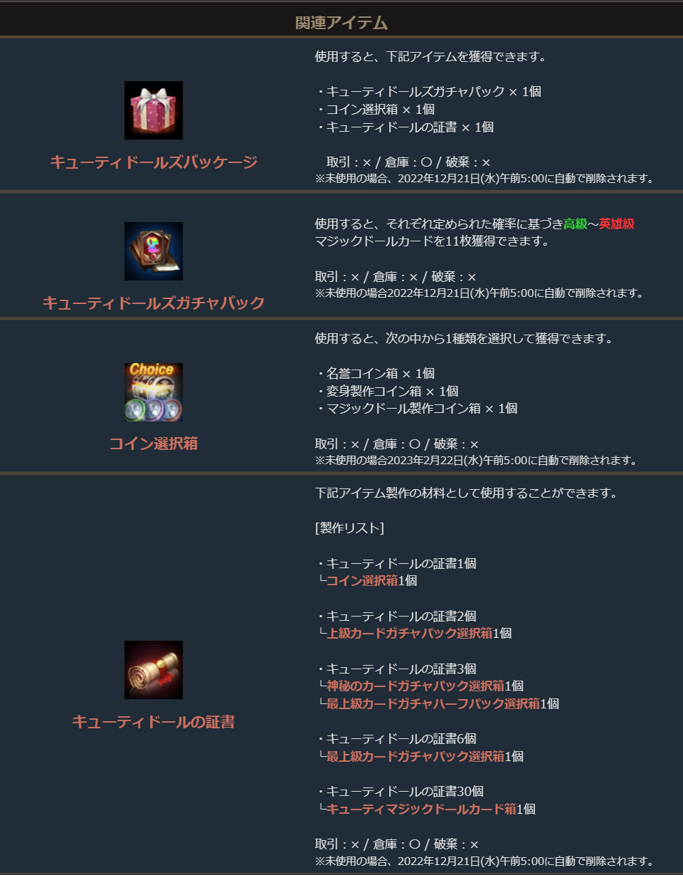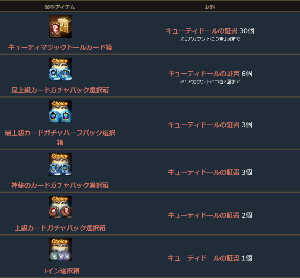 「キューティドールの証書」は、30個を材料にして英雄級マジックドールが獲得できる「キューティマジックドールカード箱」を製作できます。