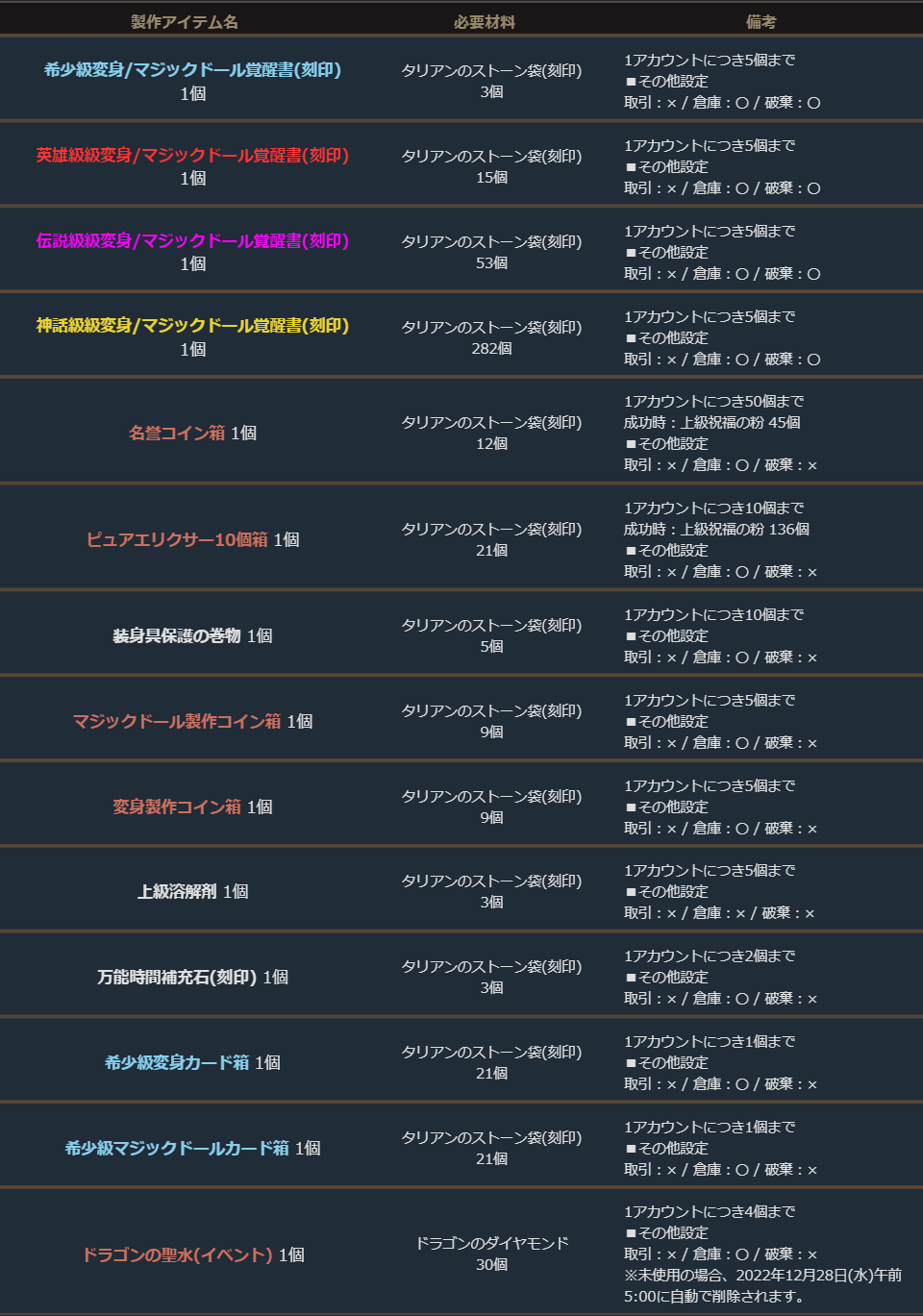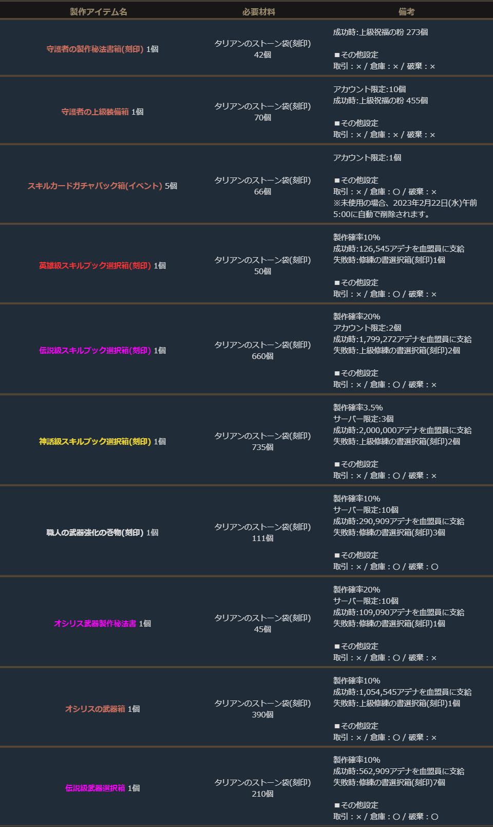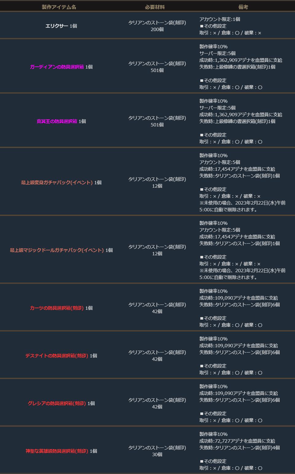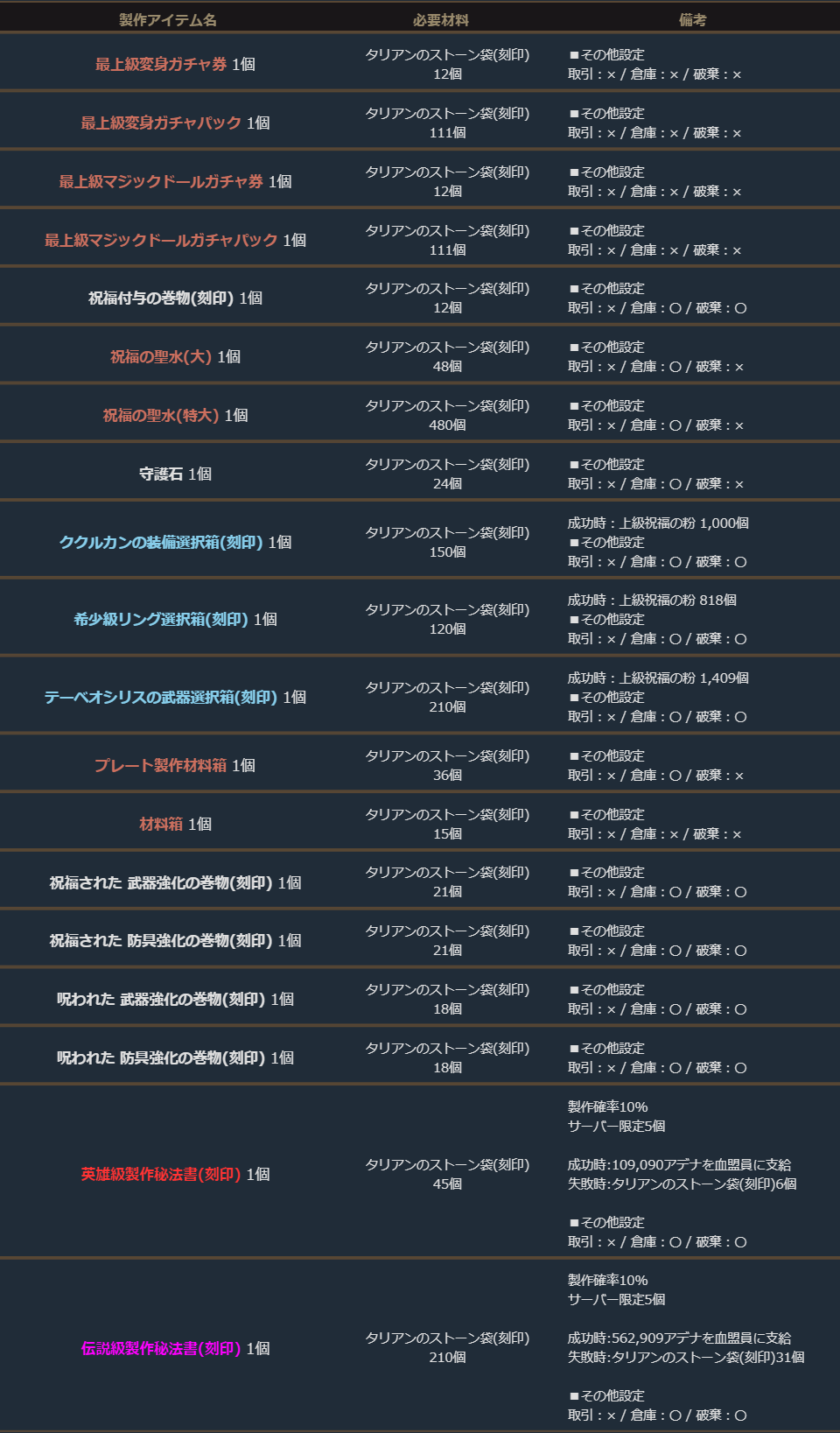 期間中、「タリアンのストーン袋(刻印)」を使用して、下記の製作を行うことができます。