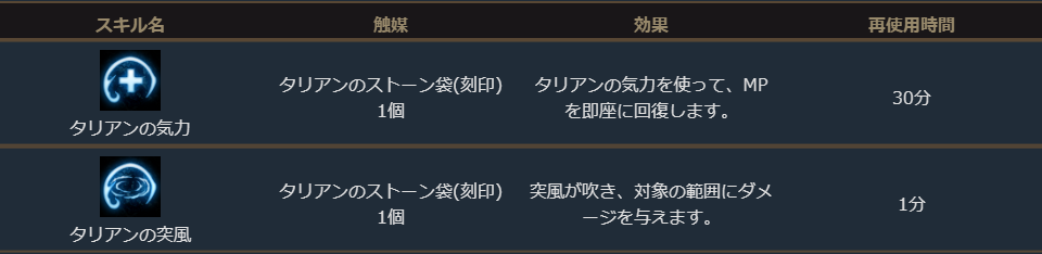 「タリアンのストーン(刻印)」装着時、下記の装備スキルを使用することができます。