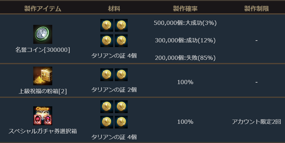 「タリアンの証」を使用して、下記の製作を行うことができます。