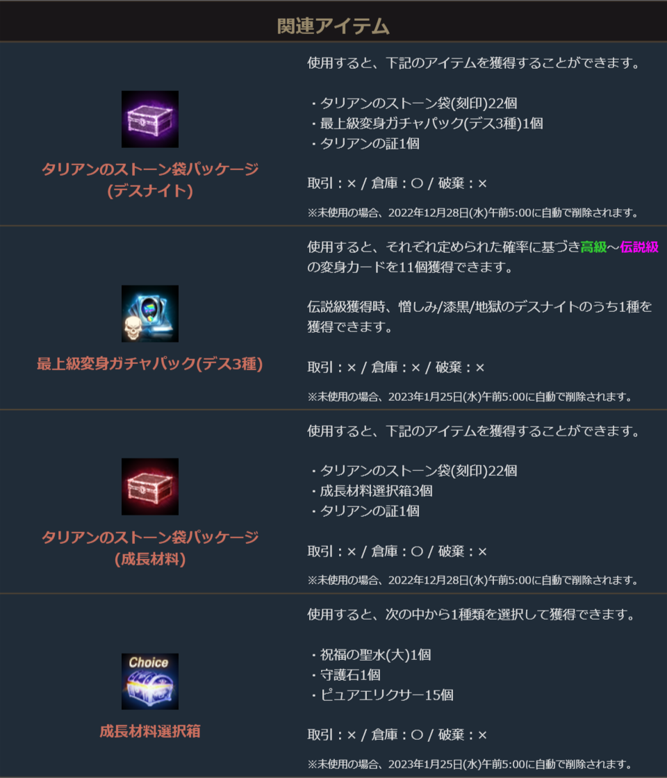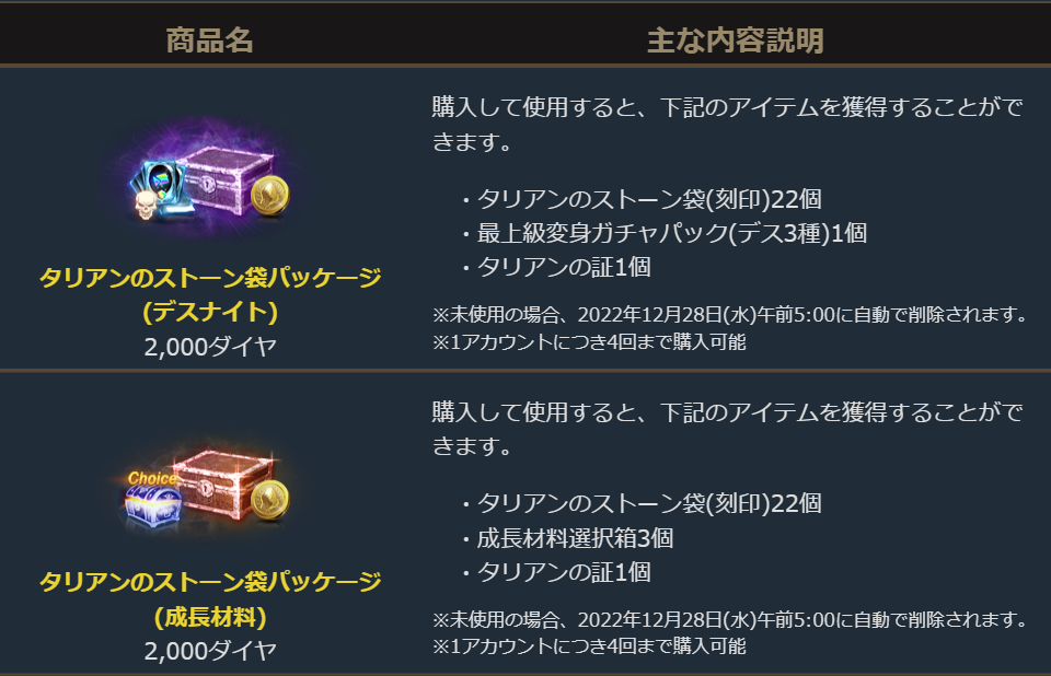 ・「タリアンのストーン袋パッケージ(デスナイト)」と「タリアンのストーン袋パッケージ(成長材料)」の商品を追加致しました。