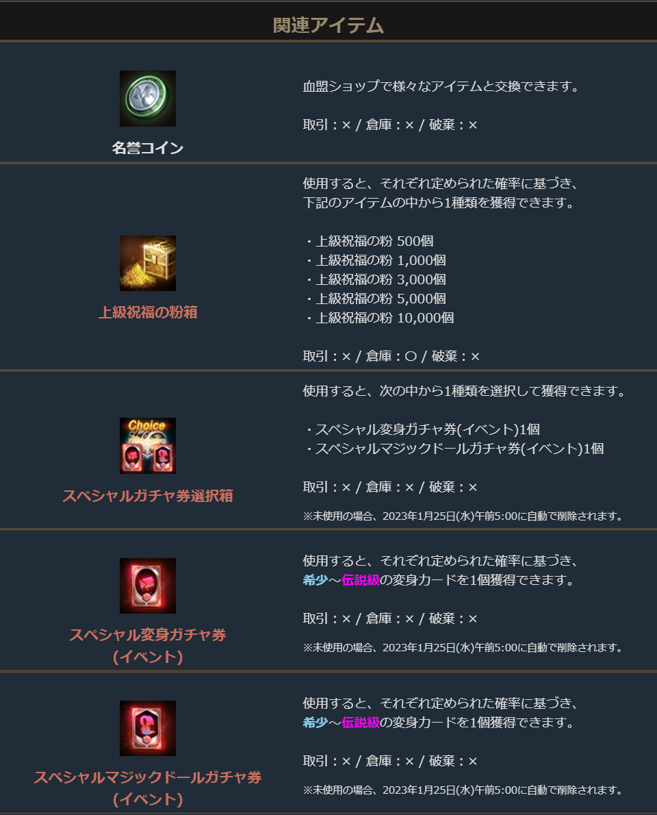 ※一部アイテムは未使用の場合、一定期間が経過すると自動で削除されます。詳しくは各アイテムの詳細をご確認ください。