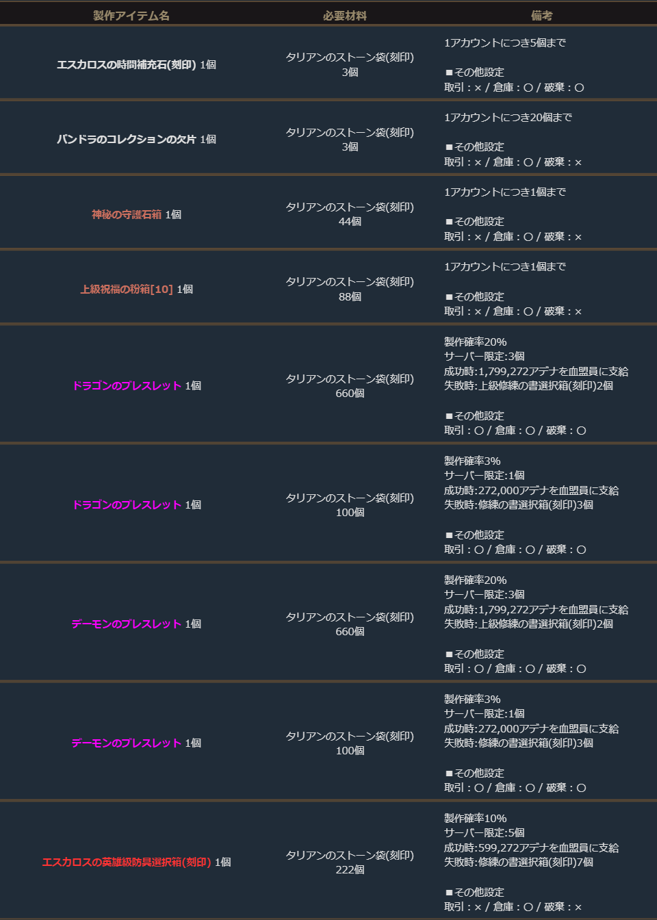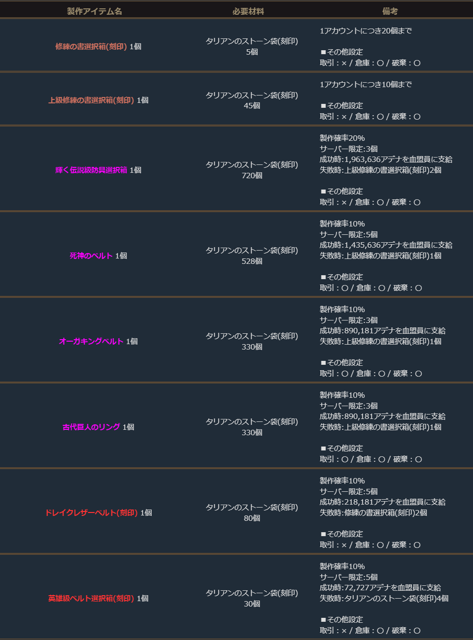 ※サーバー数量限定の製作アイテムは、各サーバーで製作できる数量に上限があります。