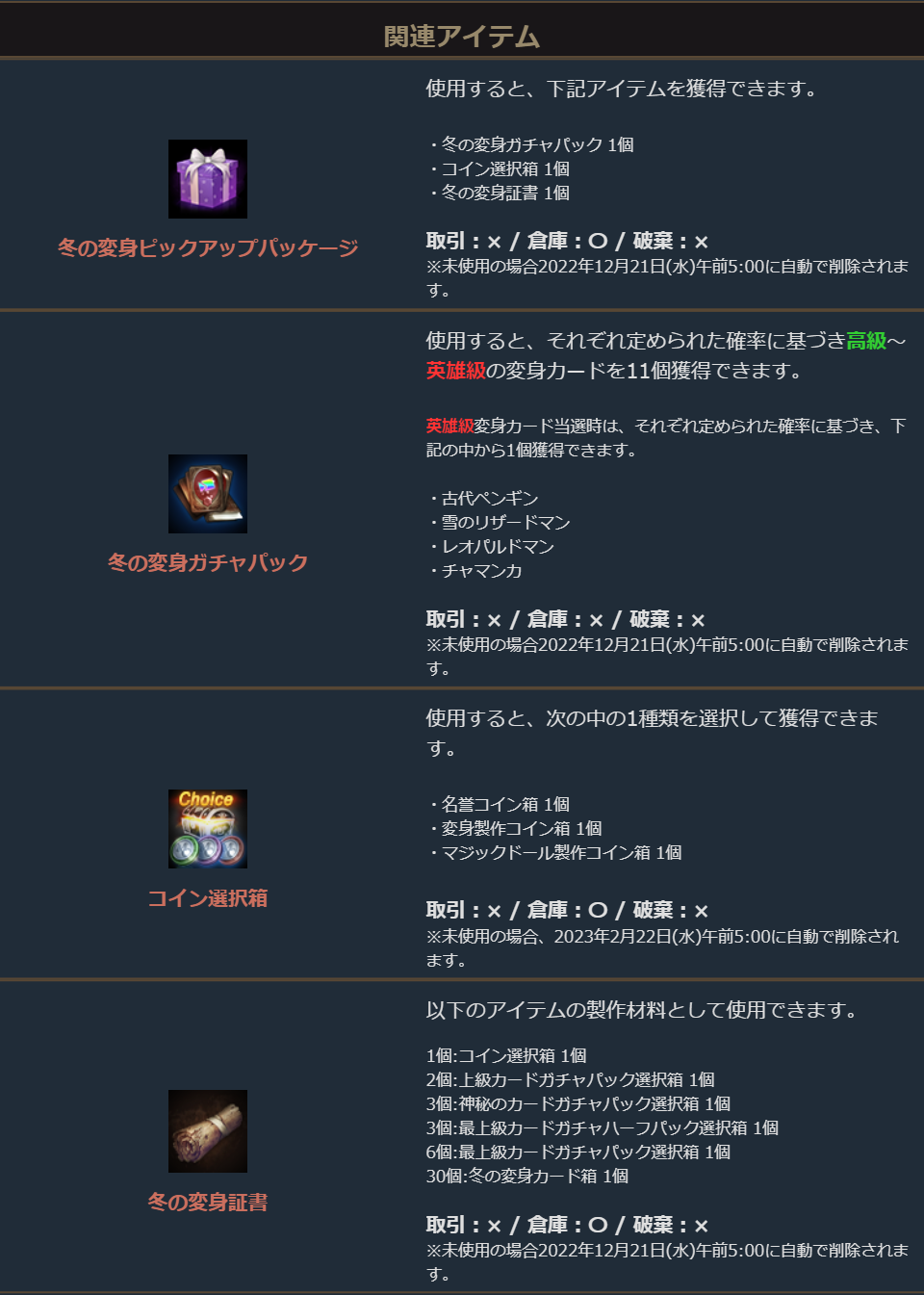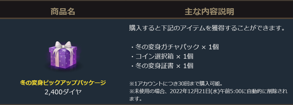 パッケージ内の「冬の変身ガチャパック」からは、英雄級変身カード当選時にピックアップされた4種の中から定められた確率で1個獲得することができます。