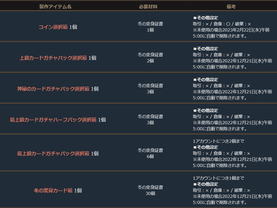 ※一部アイテムは未使用の場合、一定期間が経過すると自動で削除されます。詳しくは各アイテムの詳細をご確認ください。