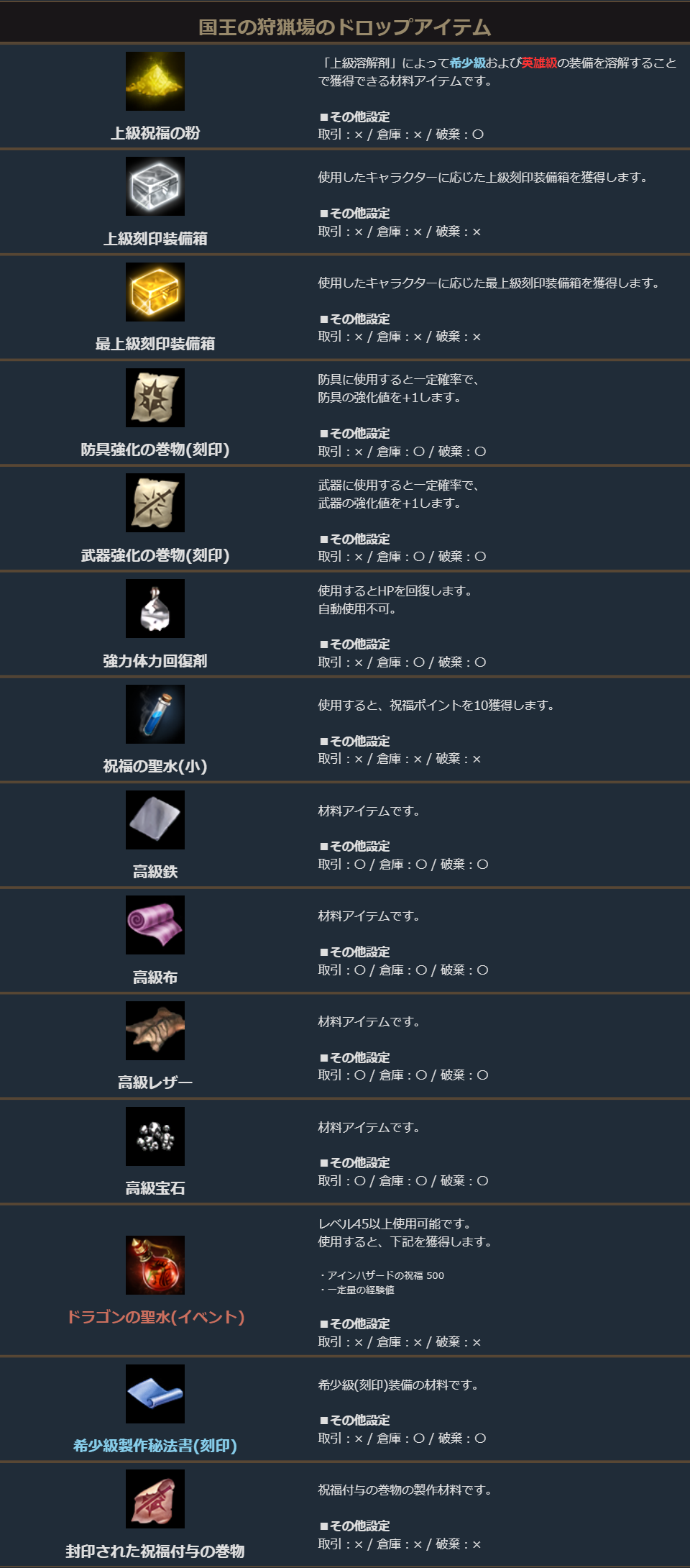 国王の狩猟場では、ドラゴンの聖水や希少級製作秘法書などがドロップします。
