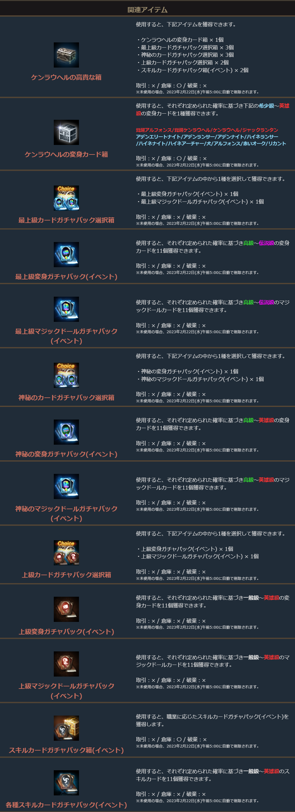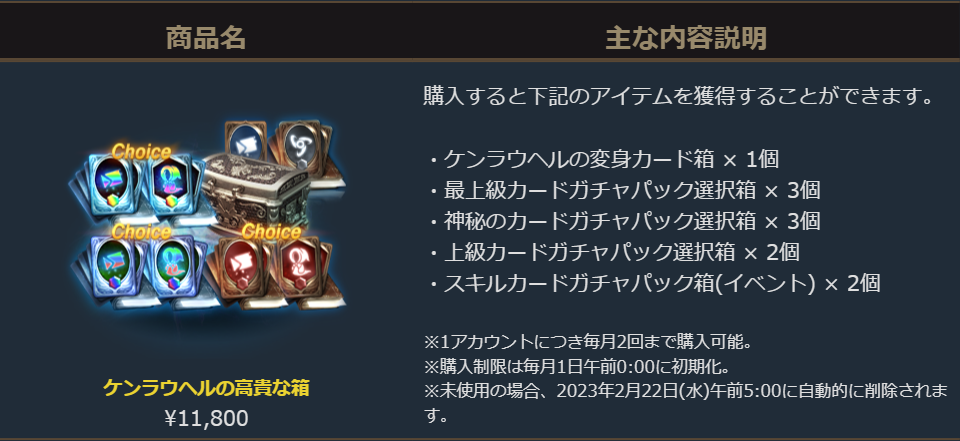 各種ガチャパック選択箱やスキルカードガチャパック箱に加え、希少級または英雄級の変身カードが獲得できるアイテム「ケンラウヘルの変身カード箱」がセットになったお得なパッケージです。