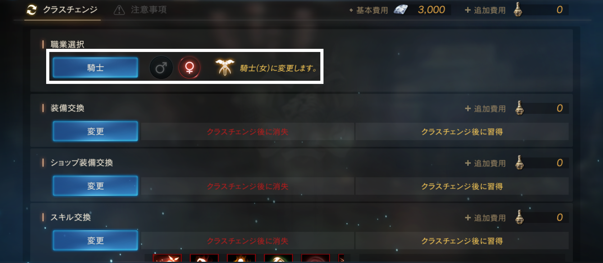 また、クラスチェンジ時に一部特定の装備やスキルを、選択した職業の装備やスキルに追加費用として「氷の女王の成長ポーション」を支払うことで交換することができます。