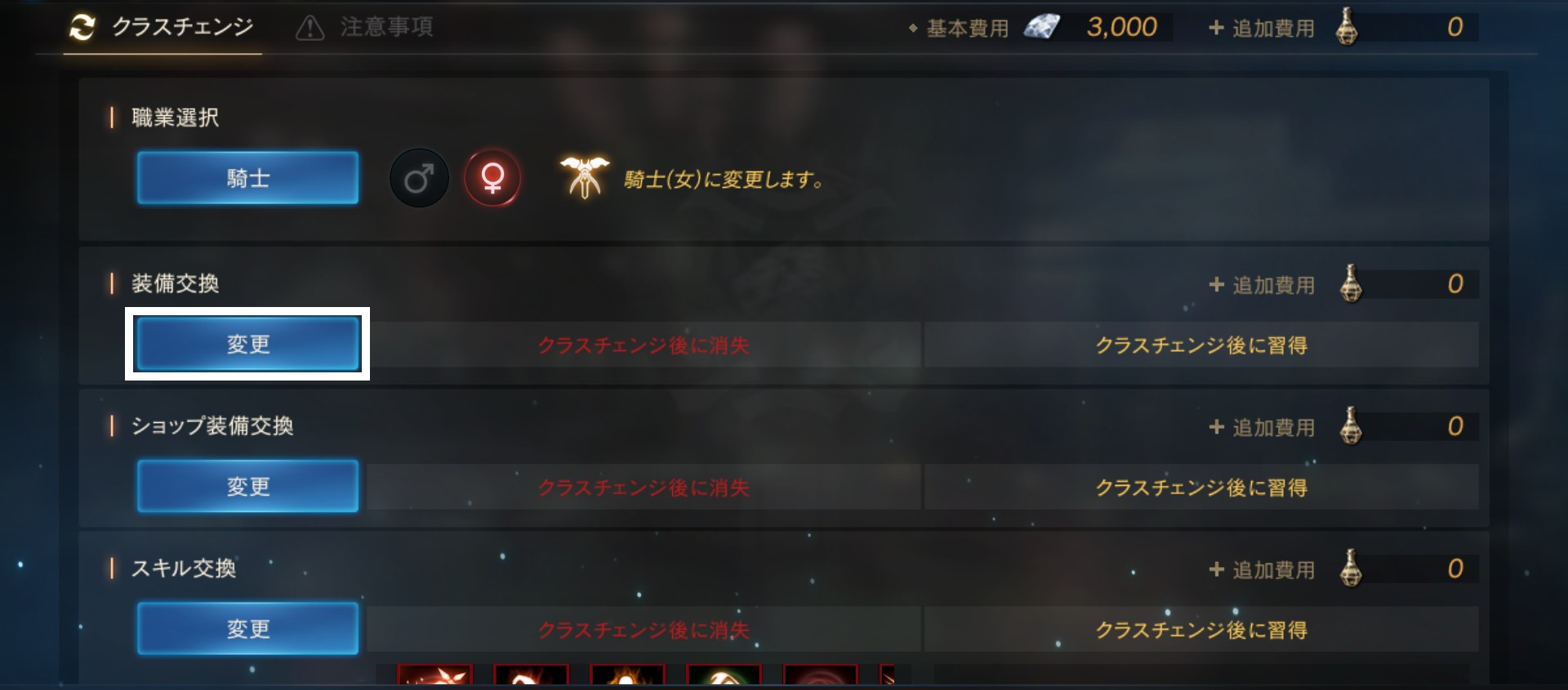また、クラスチェンジの下記手続き以外では、装備やスキル交換は出来ませんので必ず忘れずに行ってください。