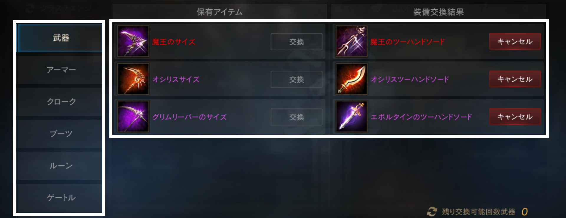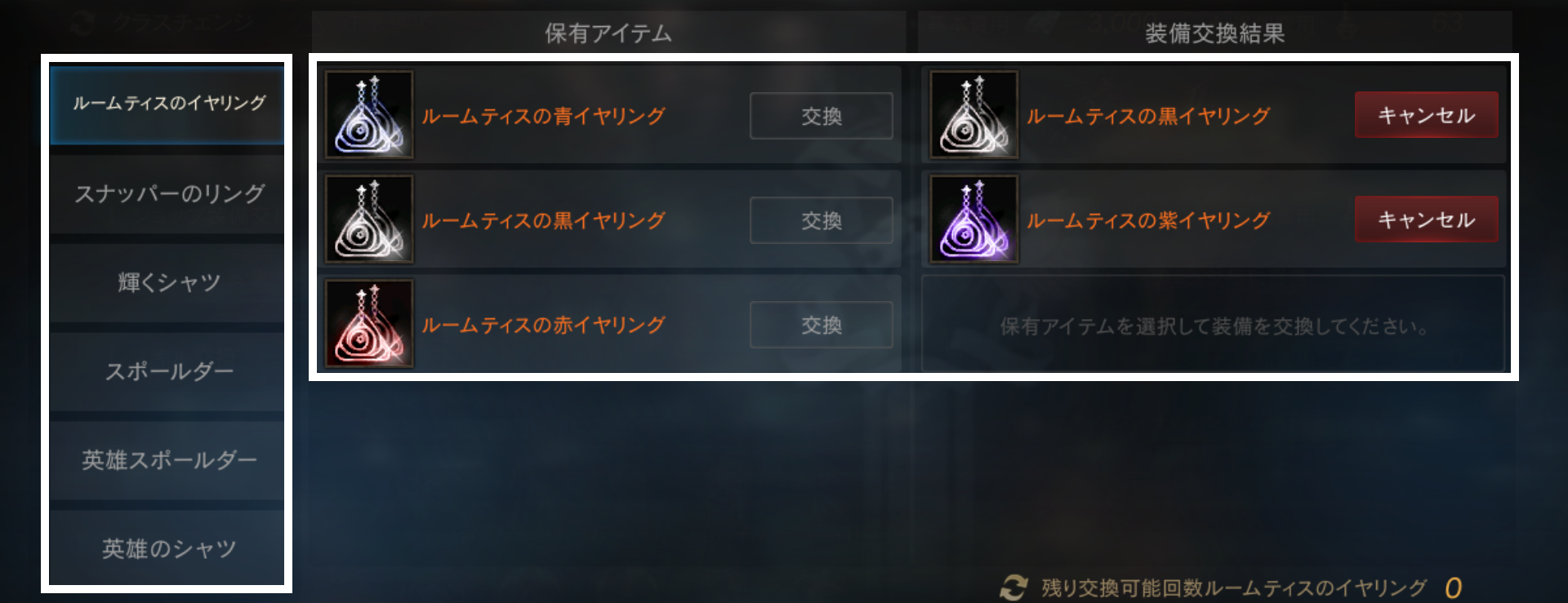 クラスチェンジを行う際に交換可能なアイテムは、希少級以上のクラスチェンジ前のキャラクターが装備可能なアイテムが対象となります。