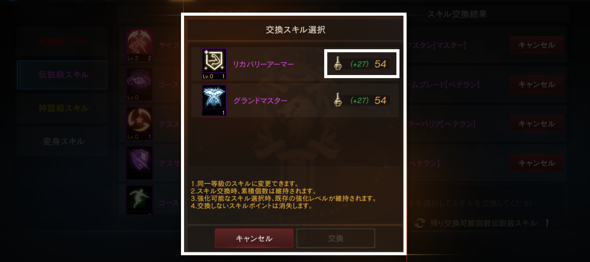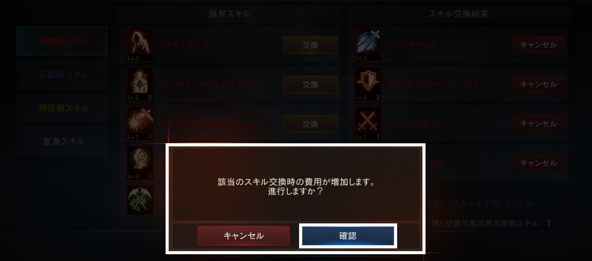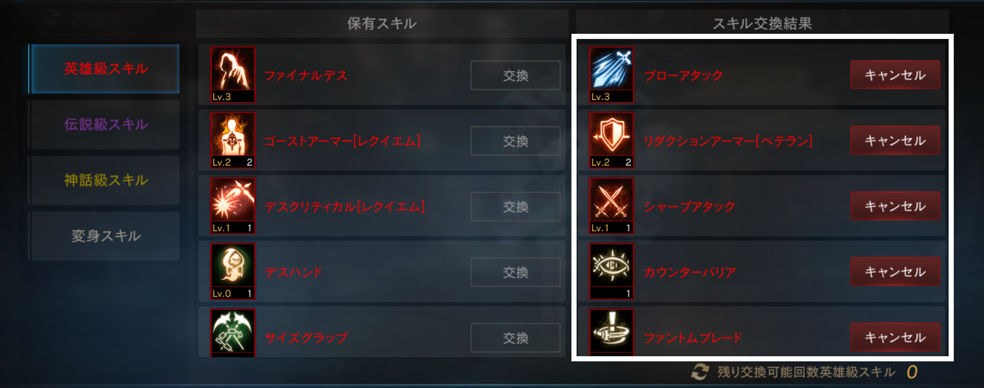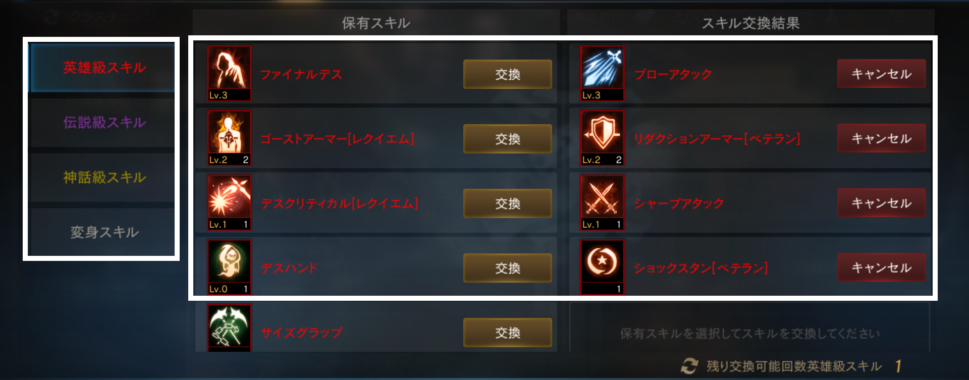 「英雄級スキル」と「伝説級スキル」は各等級ごとに最大で「5個」まで交換が可能です。