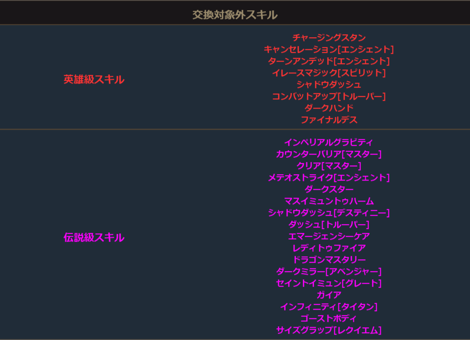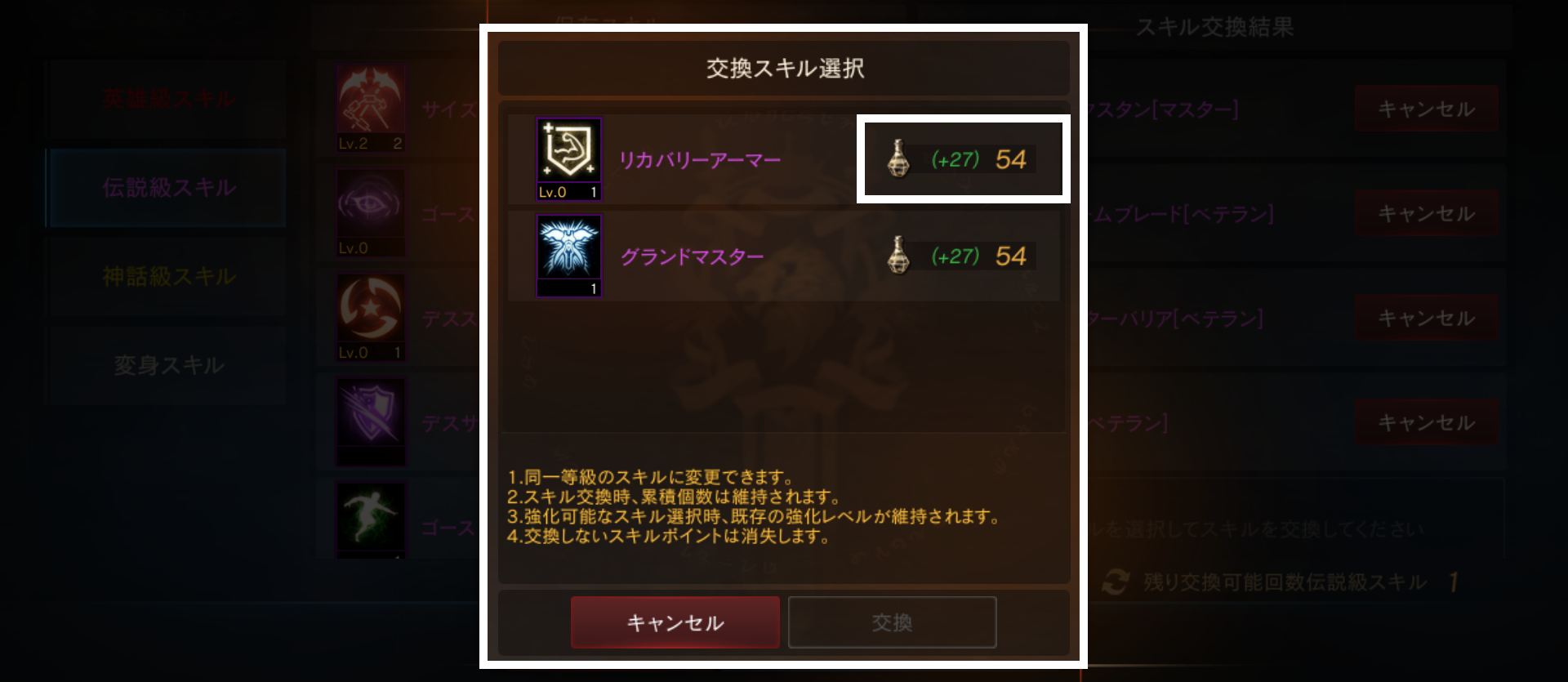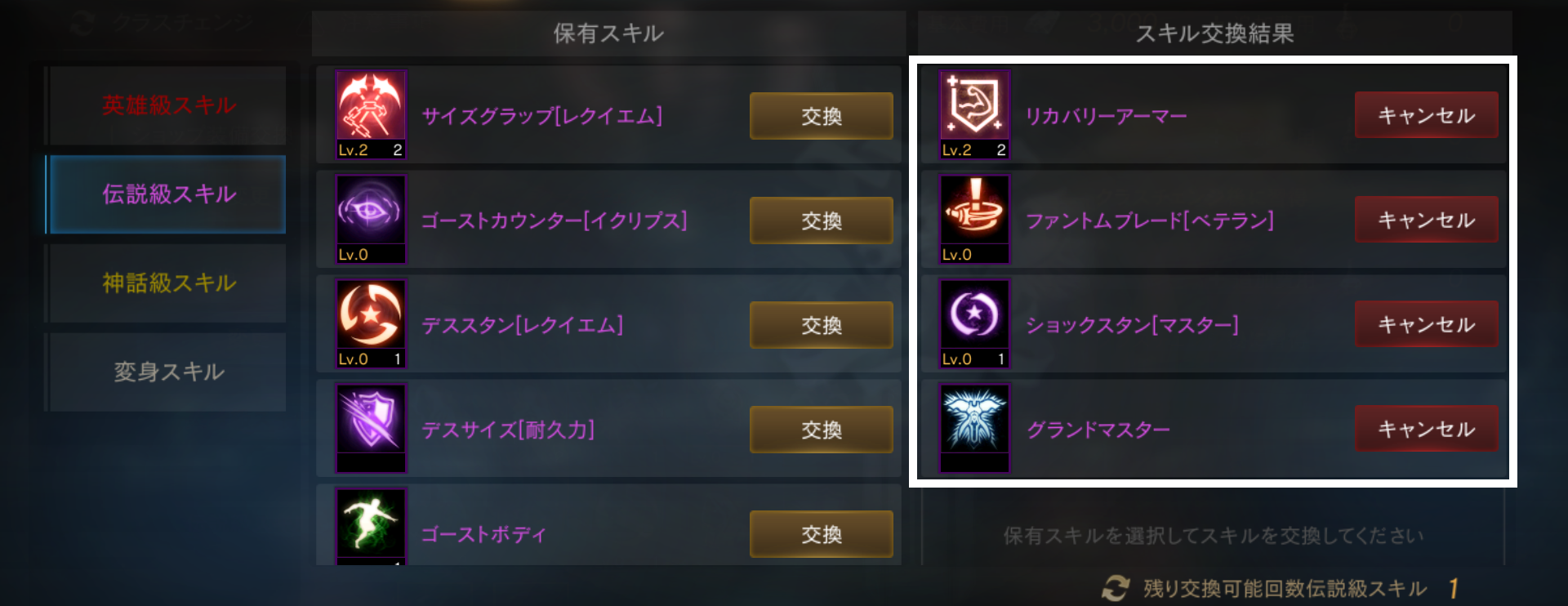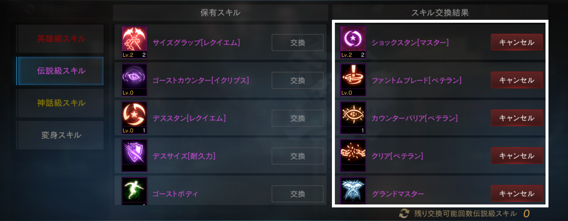 「英雄級スキル」と「伝説級スキル」は各等級ごとに最大で「5個」まで交換が可能です。