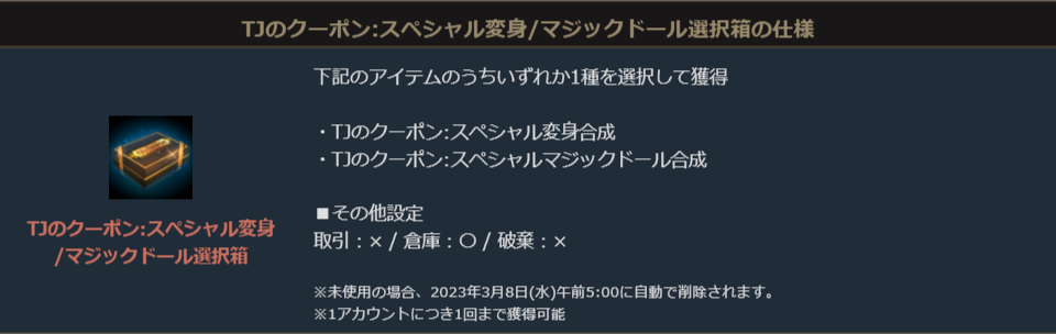 「TJのクーポン:スペシャル変身/マジックドール選択箱」を使用することで「TJのクーポン:スペシャル変身合成」または「TJのクーポン:スペシャルマジックドール合成」のいずれかを選択して獲得できます