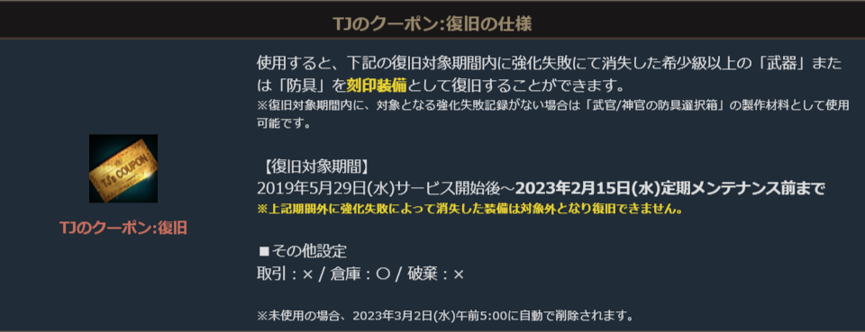 ・過去にTJクーポンで復旧を行い、その後同種/同強化のアイテムの新たな強化失敗記録がない場合そのアイテムは復旧できません。