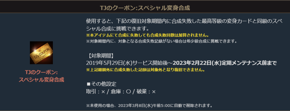 TJのクーポン:スペシャル変身合成は、対象期間内に合成失敗した最高等級の変身カードの合成に、成功時と失敗時の候補を選択して再挑戦できる特別なアイテムです。