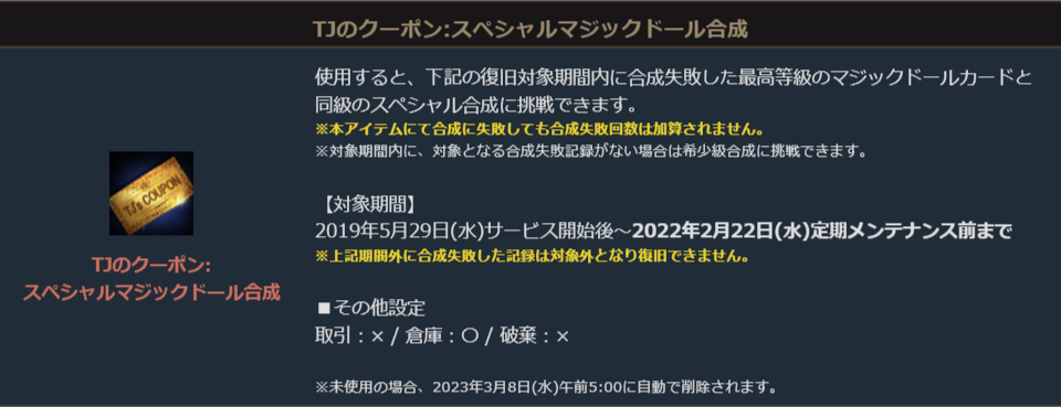 TJのクーポン:スペシャルマジックドール合成は、対象期間内に合成失敗した最高等級のマジックドールカードの合成に、成功時と失敗時の候補を選択して再挑戦できる特別なアイテムです。