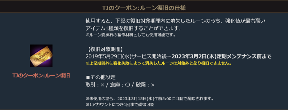 ・「TJのクーポン:ルーン復旧」を使用したキャラクターが過去に行った強化によって消失したルーンのうち、強化値が最も高いアイテム1種類を復旧することができます。