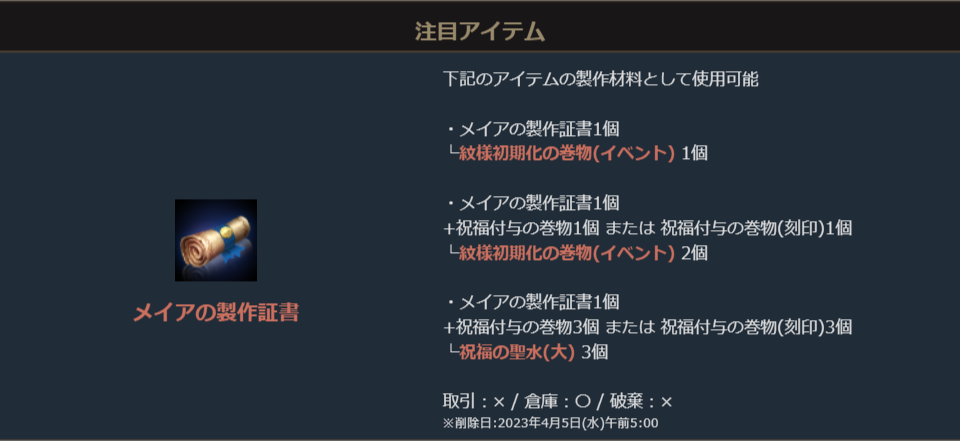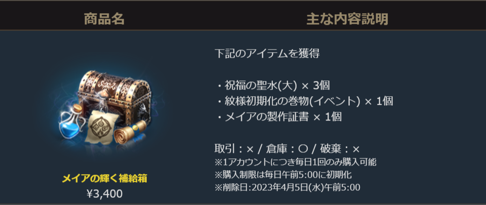 紋様の強化に使用する祝福ポイントが多く獲得できる「祝福の聖水(大)」と強化済みの紋様をリセットし強化に使用した祝福ポイントを取り戻すことができる「紋様初期化の巻物(イベント)」、さらに製作を通して「紋様初期化の巻物(イベント)」や「祝福の聖水(大)」を追加獲得できる「メイアの製作証書」がセットになった、紋様強化に便利なパッケージです。
