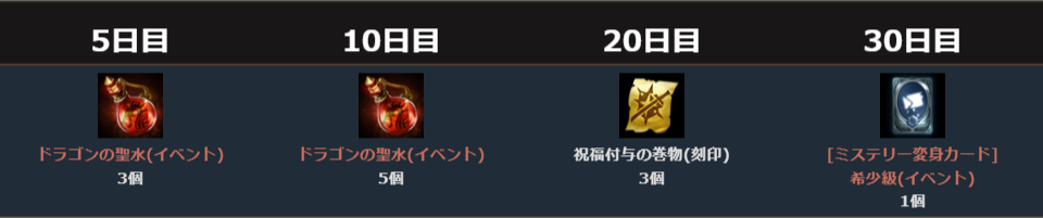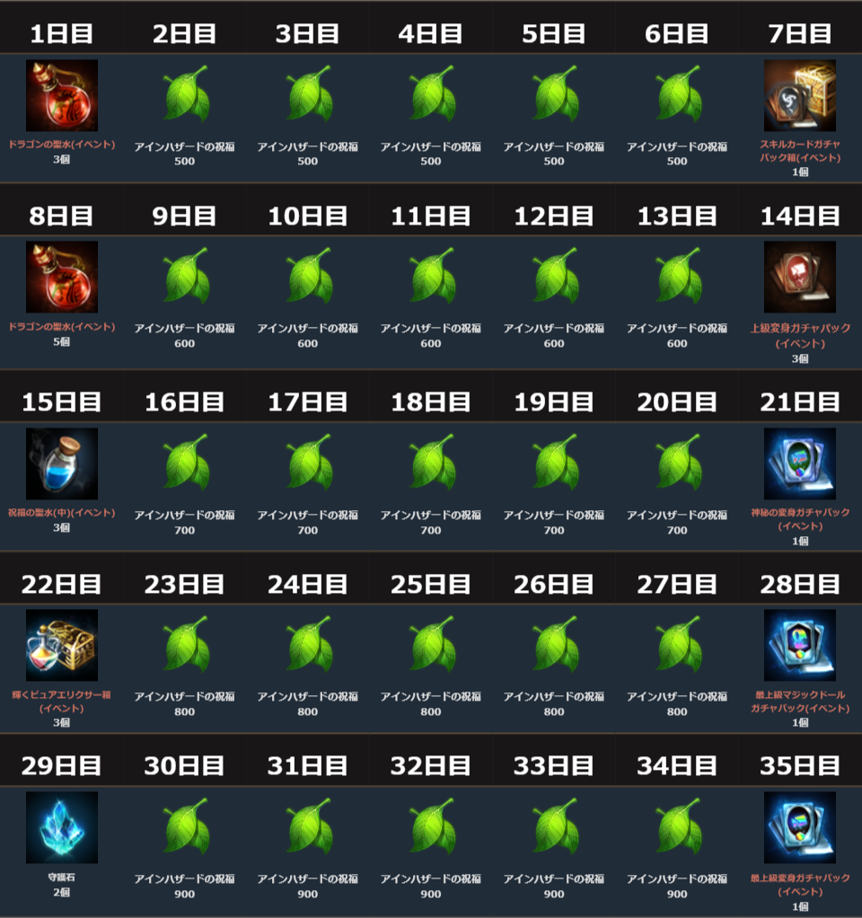 多くのアインハザードの祝福に加え、「ドラゴンの聖水(イベント)」や「輝くピュアエリクサー箱(イベント)」、「祝福の聖水(中)(イベント)」、「守護石」が手に入るほか、7日ごとに「スキルカードガチャパック箱(イベント)」や「最上級変身/マジックドールガチャパック(イベント)」といった様々なガチャパックを獲得できます。