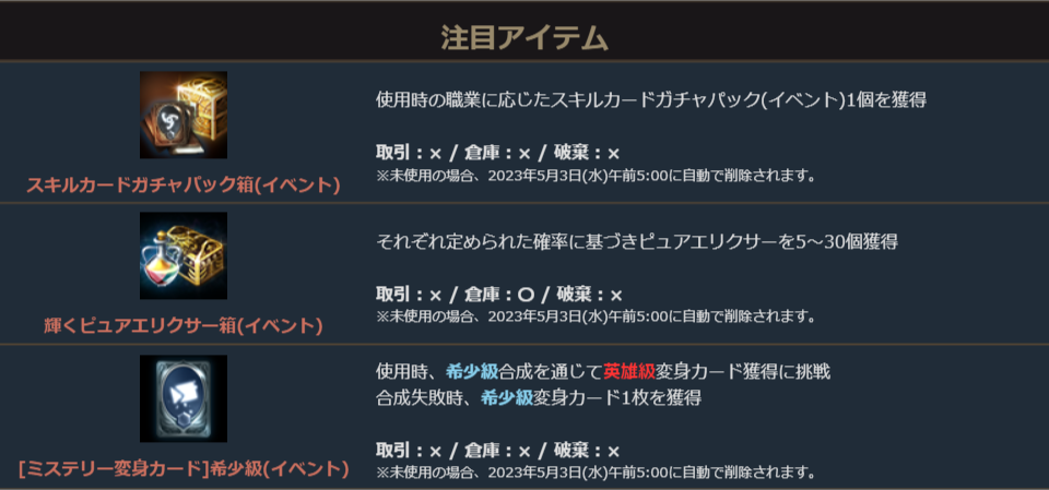 ※一部アイテムが期間終了後も未使用の場合、一定期間が経過すると自動で削除されます。詳しくは各アイテムの詳細をご確認ください。
