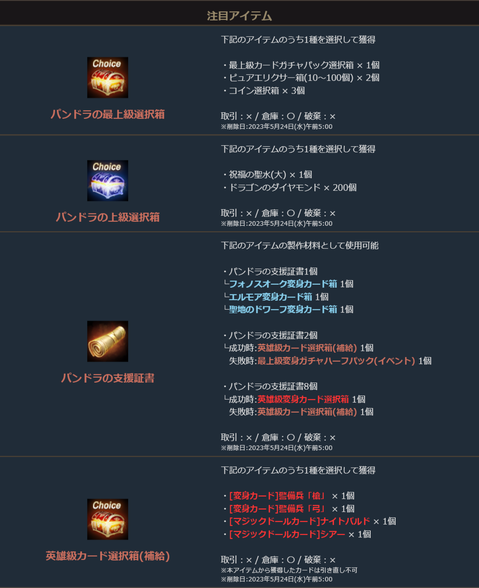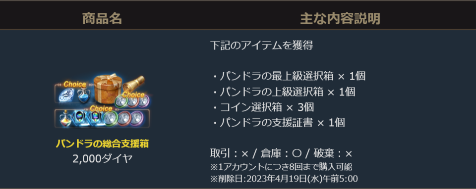 「最上級カードガチャパック選択箱」「ピュアエリクサー箱(10~100個)」「コイン選択箱」から1種を選択して獲得できる「パンドラの最上級選択箱」や「祝福の聖水(大)」「ドラゴンのダイヤモンド」から1種を選択して獲得できる「パンドラの上級選択箱」に加え、様々な貴重なカードを狙える箱アイテムの製作材料「パンドラの支援証書」と複数の「コイン選択箱」がセットになったお得なパッケージです。