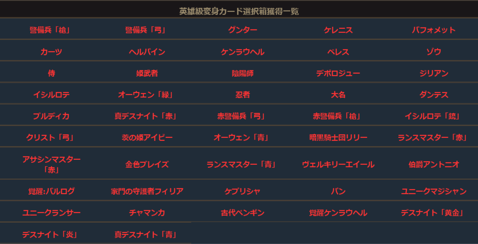 【英雄級変身カード選択箱】より獲得出来る変身カードは以下になります。