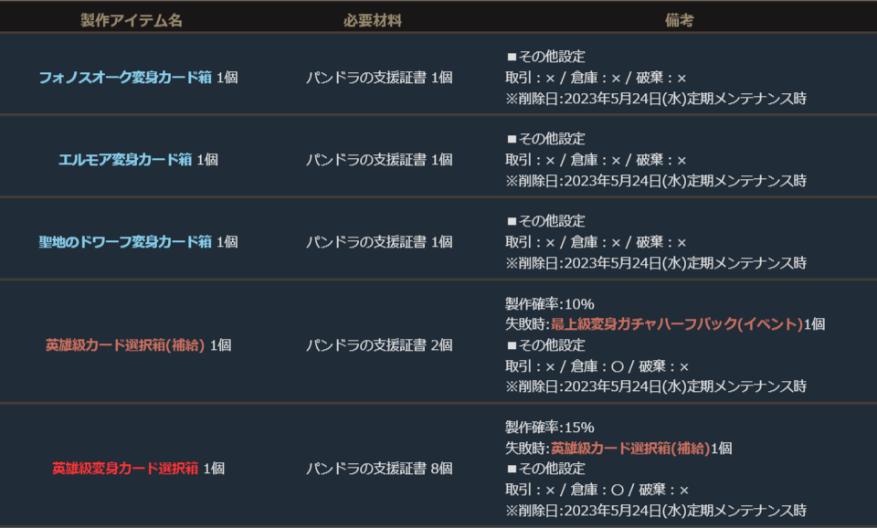 さらにその他にも「パンドラの支援証書」を材料として様々なアイテムが製作できますので、詳細に関しましては「製作アイテム」をご確認ください。