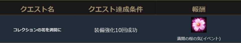 このクエストをクリアすることで報酬としてHP薬回復率増加などのバフを獲得できるアイテム「満開の桜の気(イベント)」を獲得できます。