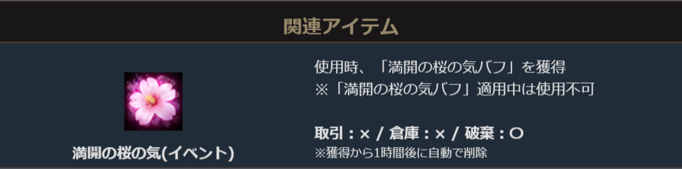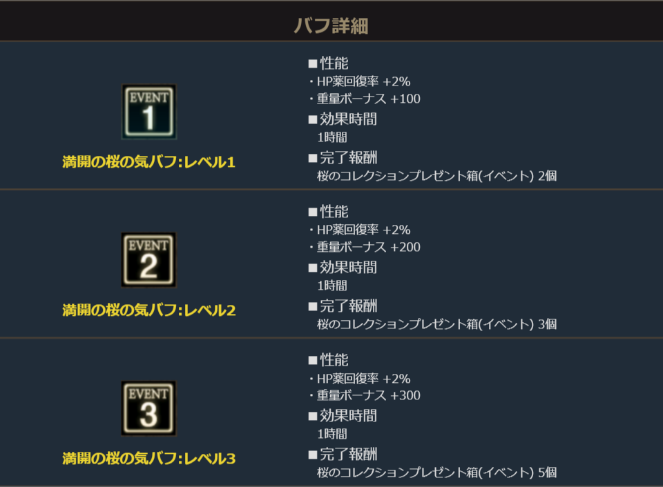 「満開の桜の気(イベント)」によって発動するバフは1時間ごとに段階が上がって一部効果量が増加していくとともに(最大3段階)、各段階終了時に特別なイベントアイテムを獲得することができます。