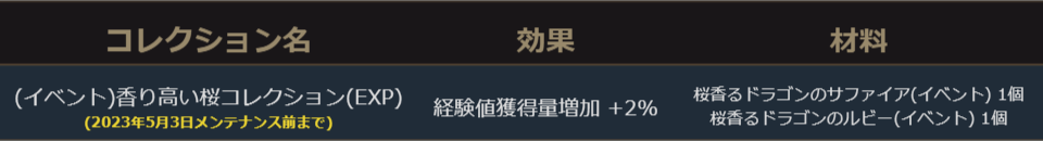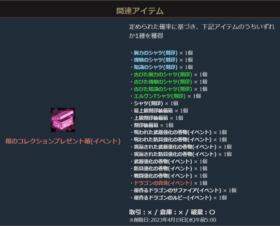 「満開の桜の気バフ」各段階終了時に獲得できるアイテム「桜のコレクションプレゼント箱(イベント)」は使用することでコレクションなどに使用できる様々なアイテムが獲得できます。