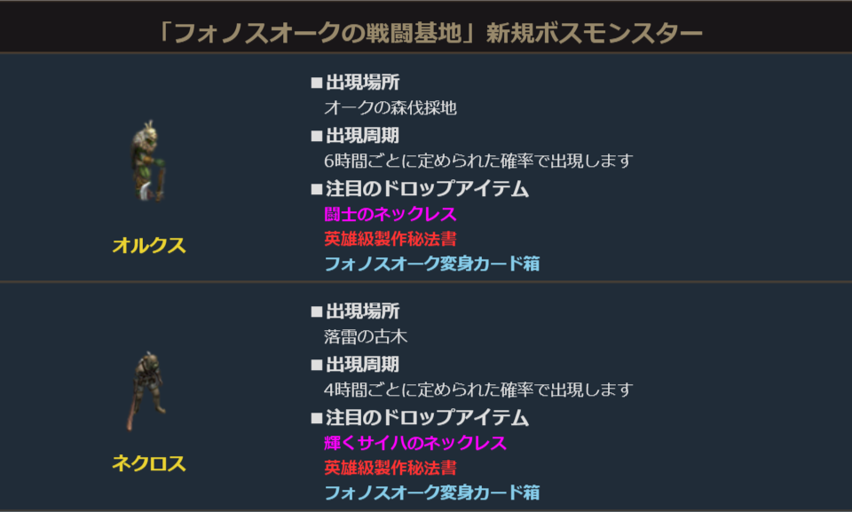 新たなモンスター「フォノスオーク」の追加を行い高レベル向けの狩場へとリニューアルしました。