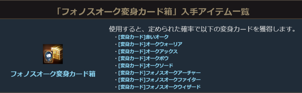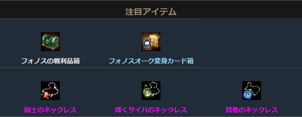 リニューアル後のフォノスオークの戦闘基地地域にて獲得出来る注目アイテムは以下になります。