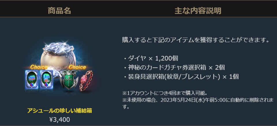 ダイヤ1,200個で3,400円という価格はそのままに「神秘のカードガチャ券選択箱」と「装身具選択箱(紋章/ブレスレット)」が一緒に手に入るお得なパッケージです。