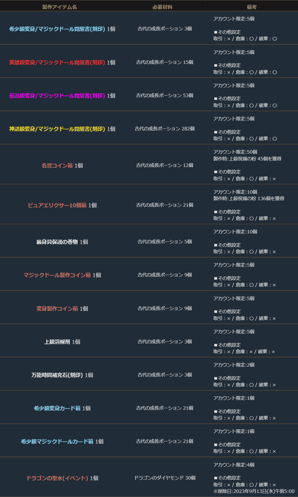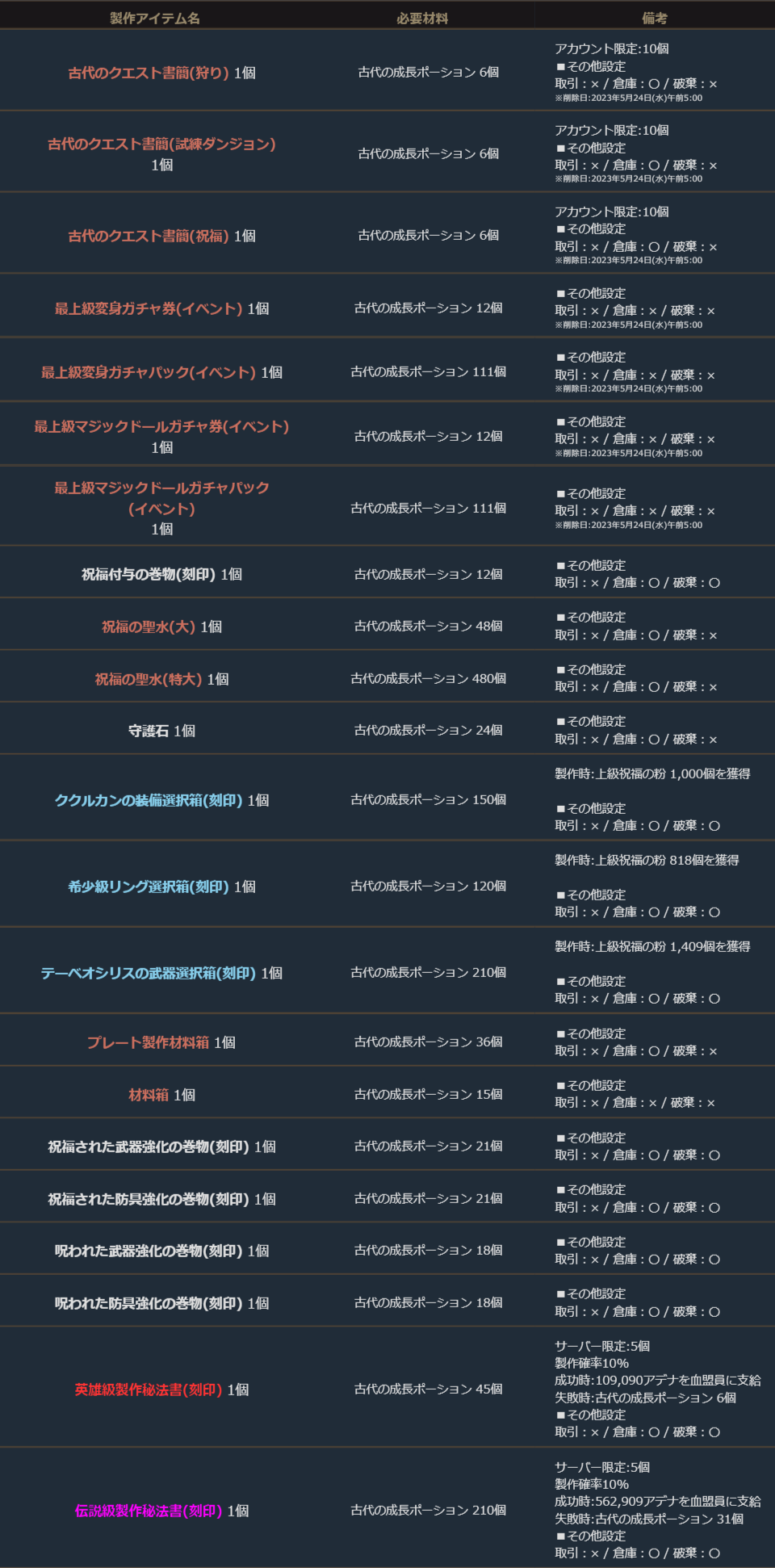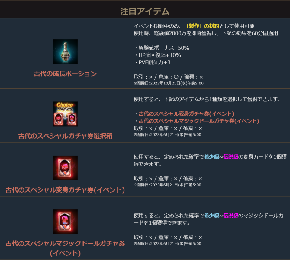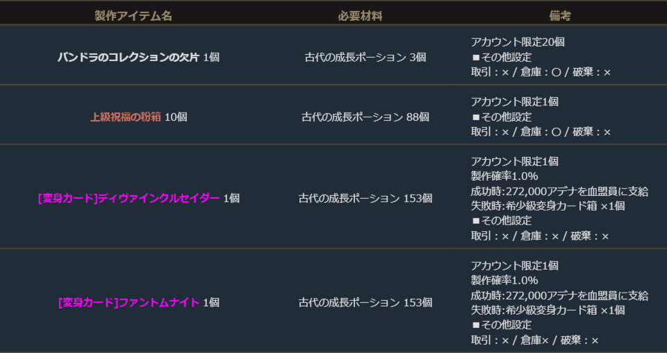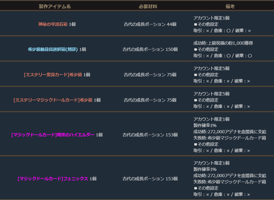 期間中、「古代の成長ポーション」を使用して、下記の製作を行うことができます。
