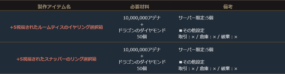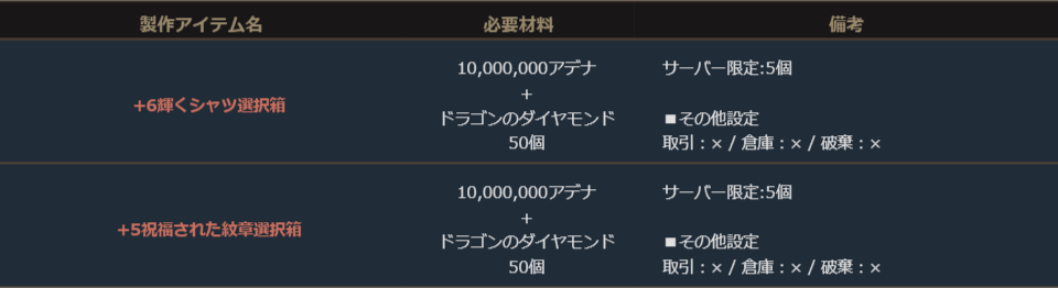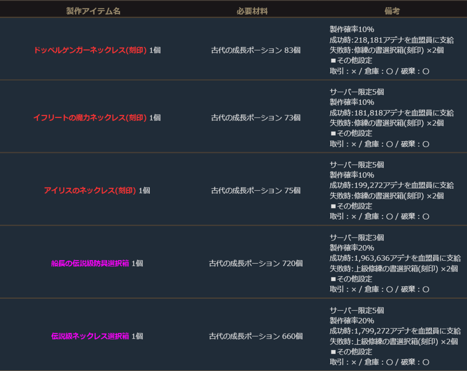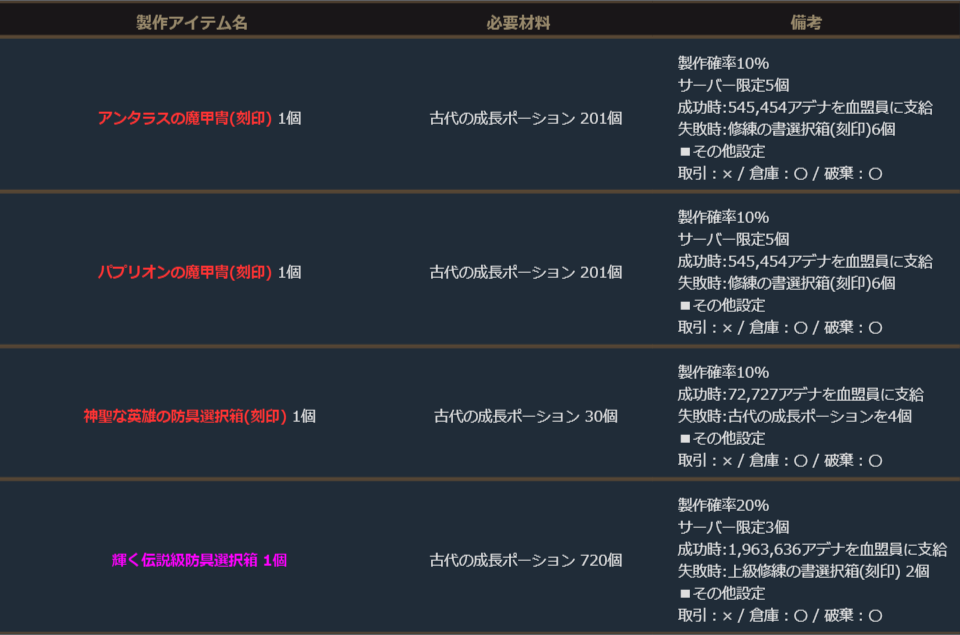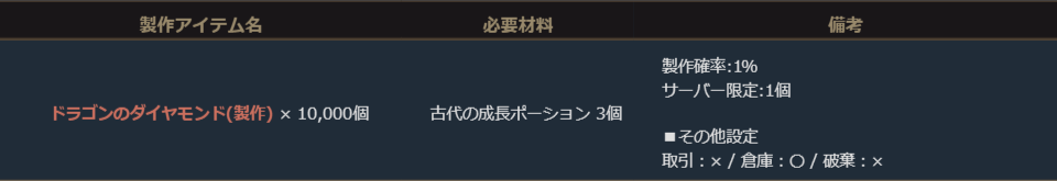 ※サーバー数量限定の製作アイテムは、各サーバーで製作できる数量に上限があります。